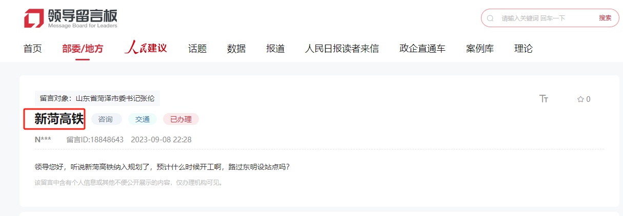 近日,有网友在人民网-地方领导留言板上留言询问称:“新菏高铁预计何时开工,会在东明设站吗?”
