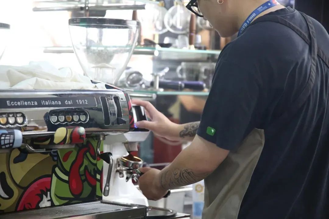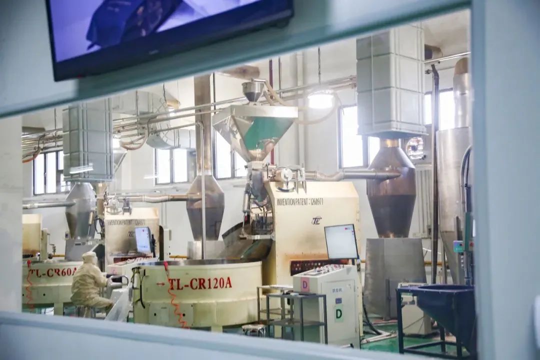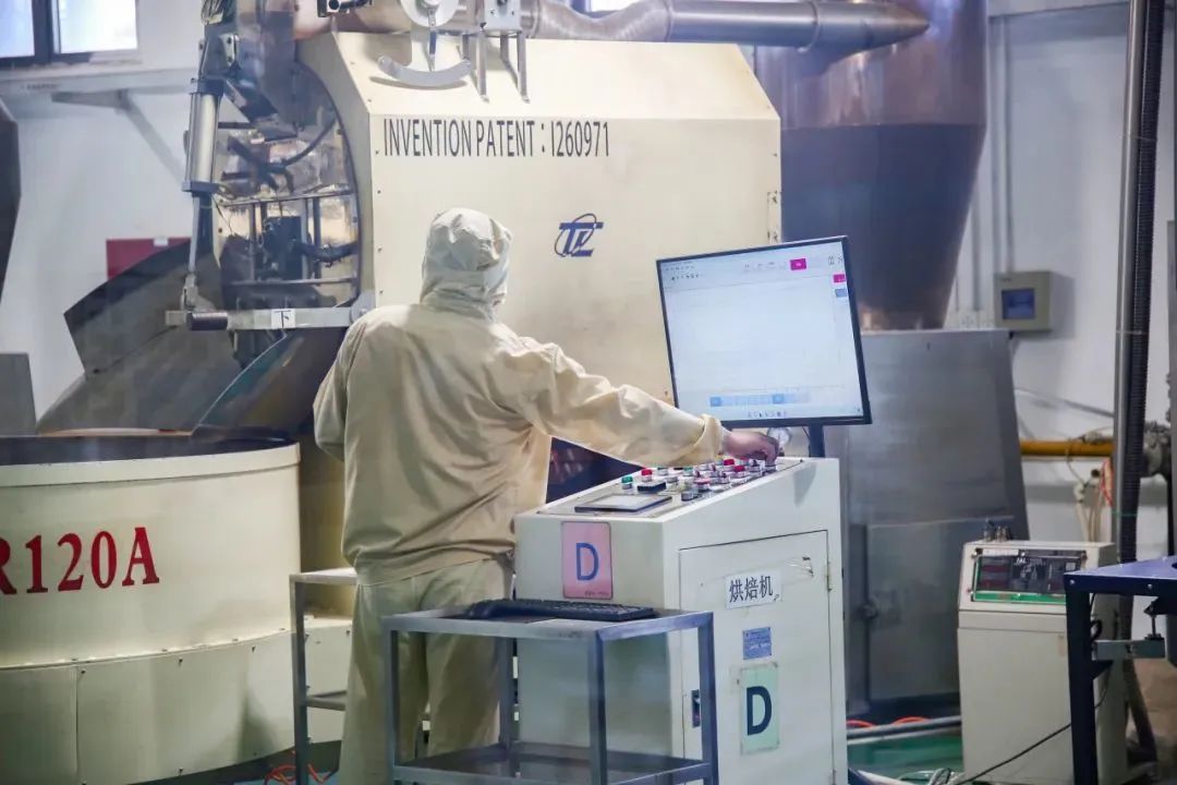 在工厂的观光通道,墙面上展示着“烘豆环境步骤”,隔着玻璃可以直接看到品皇咖啡生产的全过程。仓库里整整齐齐地摆放着一袋袋尚未烘烤的咖啡豆。另一边的生产车间,几名工人正在烘烤咖啡豆,据企业负责人介绍,工厂引入了来自意大利的全新机器,这台机器更加环保。看着工人工作的背影,可以用最直观的方式了解品皇咖啡是如何生产的,从咖啡豆的挑选,到烘焙过程中的把控,再到咖啡研磨与萃取的精细操作,最后再包装成袋。