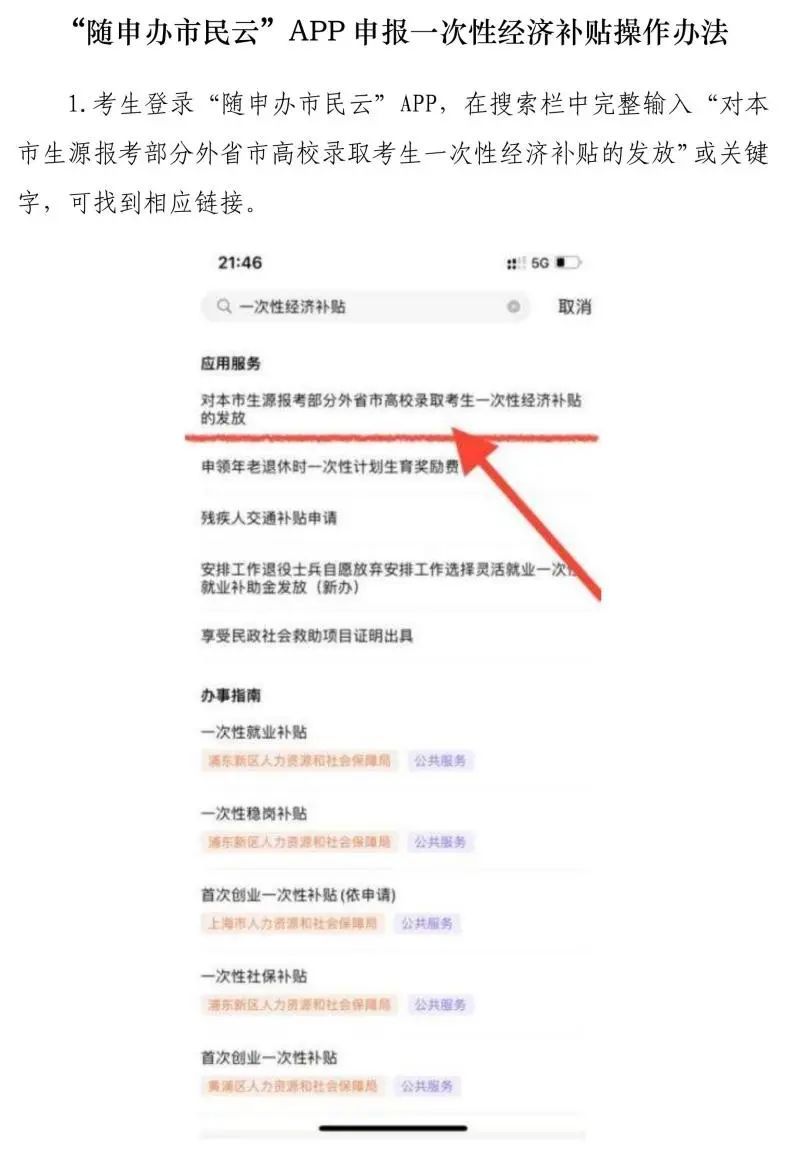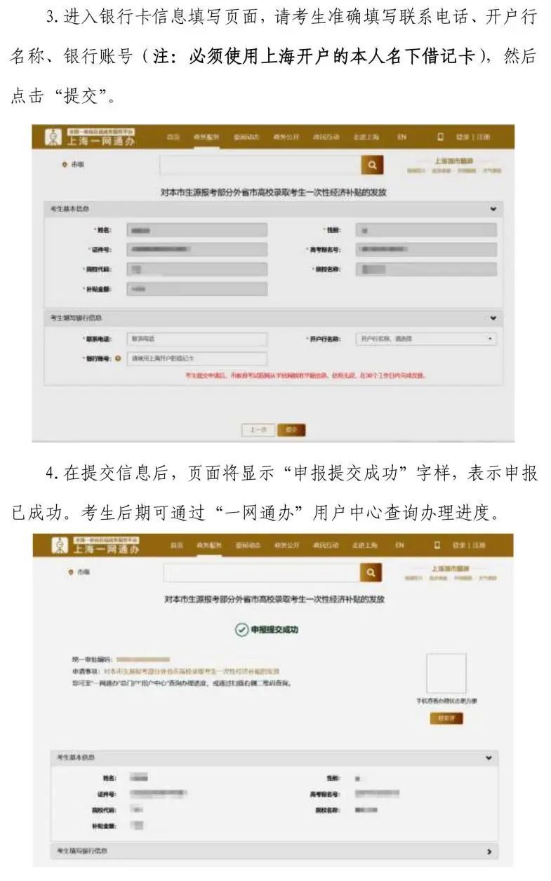 符合条件考生可于2023年10月8日至12月31日期间登录“一网通办”网站(https://zwdtuser.sh.gov.cn/)或“随申办市民云”APP,搜索关键字“一次性经济补贴”找到补贴申请链接(具体操作办法附文末),登入补贴申请平台并填写相关申请信息(注:申请信息中的银行卡必须使用上海开户的本人名下借记卡)。