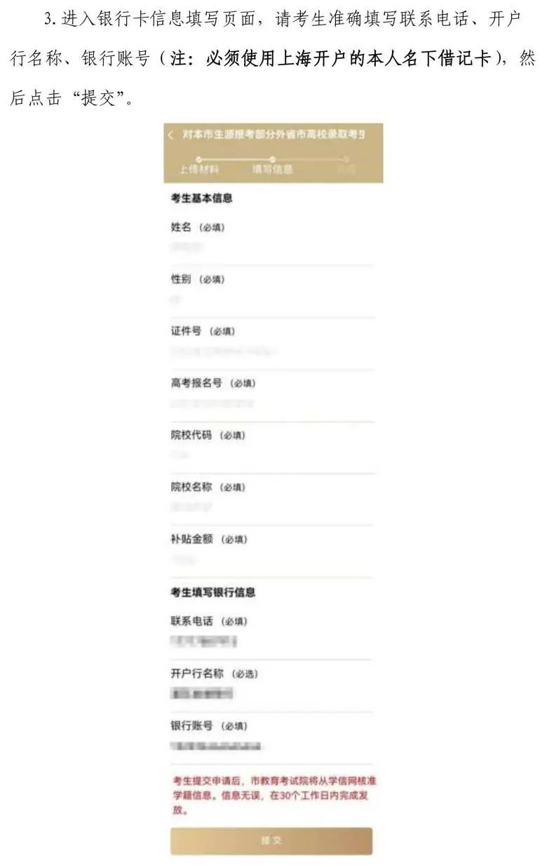 上海市教育考试院在审核考生补贴申请信息无误后,将进行补贴发放。补贴发放过程中若因考生填写信息有误导致无法正常发放的,市教育考试院将通过短信(考生参加秋季高考报名时注册的手机号码)发送更正提示,请考生按照提示信息及时进行信息更正。补贴发放工作将在30个工作日内完成。考生可通过查询银行卡信息,及时了解补贴款发放情况。