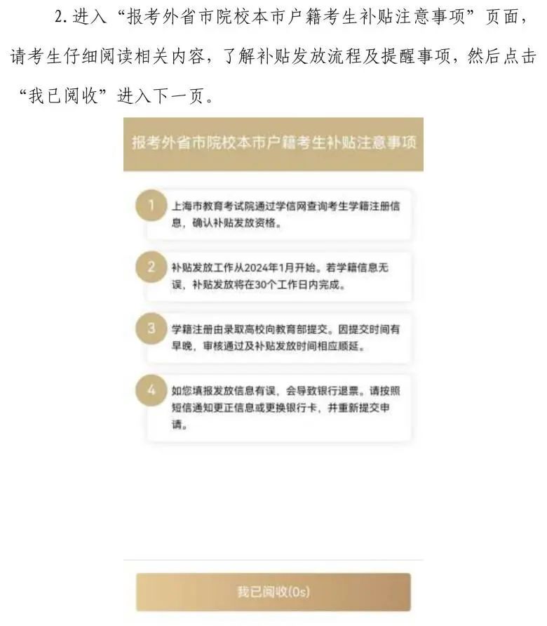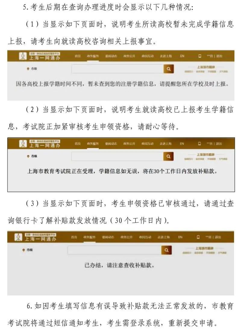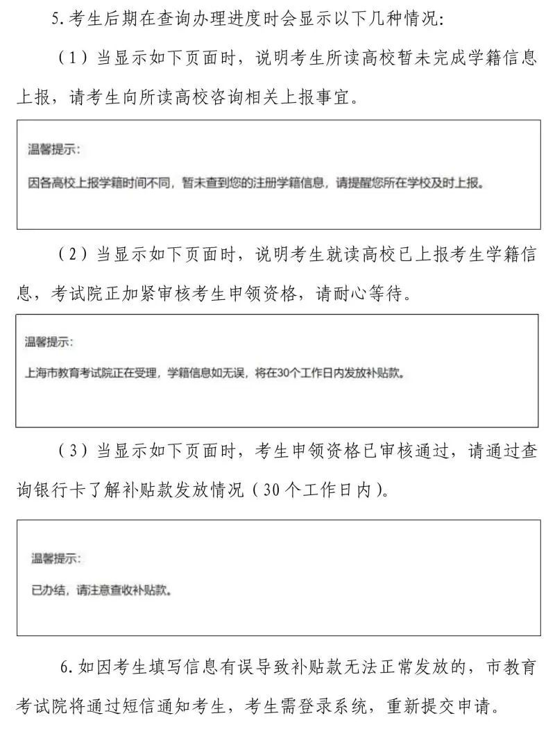 上海市教育考试院将于2024年1月开始根据教育部“中国高等教育学生信息网”(简称“学信网”)更新的考生学籍注册信息,审核考生的补贴发放资格。特别需要注意的是,由于各院校向教育部上报考生注册入籍信息的时间会影响学信网上考生学籍注册信息的更新,故资格审核的时长也存在差异。考生可通过申报平台查询办理进度。
