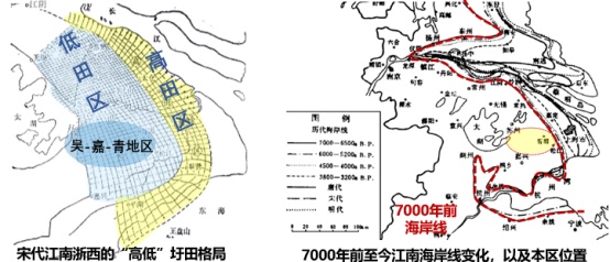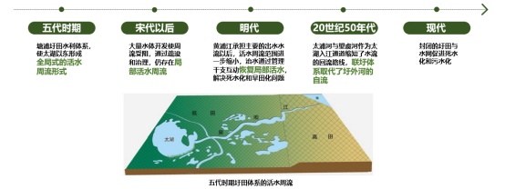 示范区的区域资源禀赋和江南水乡特色,成就于历史进程中逐渐发展的生态环境、文化环境、聚落布局一体性的独特处理。在漫长地理变迁中本区经历了“由海到陆”的巨大变迁,形成了地势低于周边的“潴水之泽”,为此史前遗迹密度较周边其他陆地为低。元 . 任仁发称:“浙西之地,低于天下;而苏州又低于浙西、淀山湖又低于苏州,此低之又低者也”(《农政全书》卷13)。近2000年来区域自然条件变化,为应对“低之又低”的地势、“众水来归”的挑战,本区发展了依自然水系条件,采取单圩、联圩两大类,多种小类的灵活工程策略,成为太湖水乡圩田建设最具亮点的典型区域。自唐五代以来,地区地表形态发生了很大变化,水患问题得到了一定遏制。