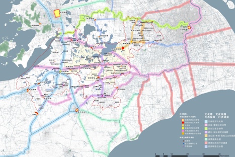(2)聚落体系上,以历史城镇为基础,建设文化廊道,突出展示历史城镇的聚落体系。为此,营造“一纵一横”两大文化带,打造示范区文化旅游精品路线。其中,一纵是江南运河文化带,以苏州、嘉兴和吴江老城为依托,利用江南运河在本区的东、中、西三线,串联震泽、平望、桃源、盛泽等历史古镇,发展苏-嘉 / 苏-湖城际“水上巴士”探访专线。一横是太湖-黄浦江文化带,以吴江、嘉善老城为依托,通过拦路港、太浦河、太蒸港、七仙泾四股水路,分别串联同里、周庄、平望、黎里、芦墟、练塘,以及枫泾等古镇,发展“浦江溯源”水上文化线路。示范区文化旅游精品路线方面,依托嘉善塘-伍子塘-西塘镇-泥鱼荡-金泽镇-淀山湖-淀浦河-老通波港,串联西塘、金泽、朱家角、青浦等古镇,连接嘉兴-嘉善-西塘-金泽-淀山湖-朱家角-青浦老城-吴淞江等,发展 “小楫轻舟”的定制型文化探索线路,探索“上海之根”历史文化遗迹。