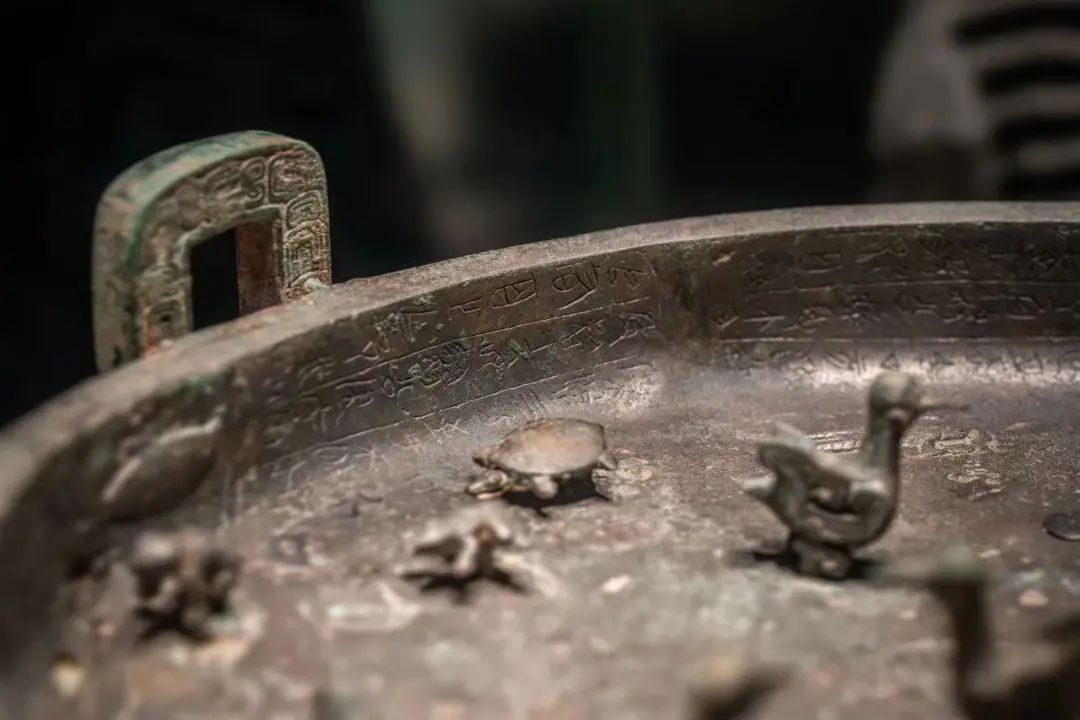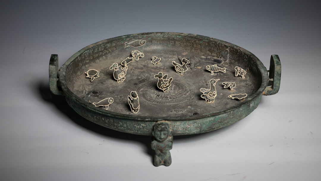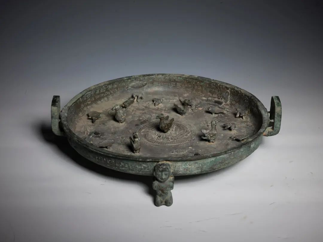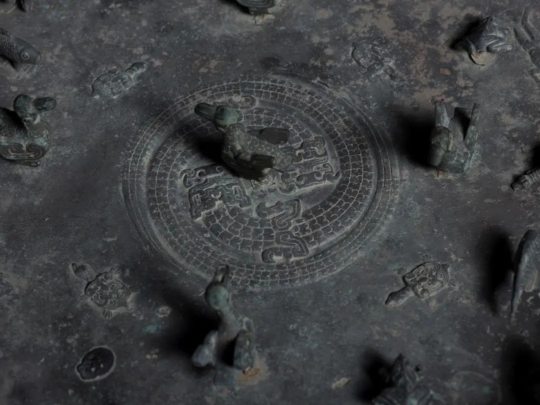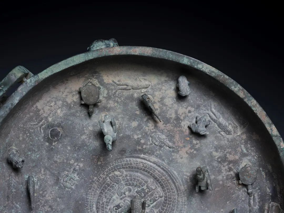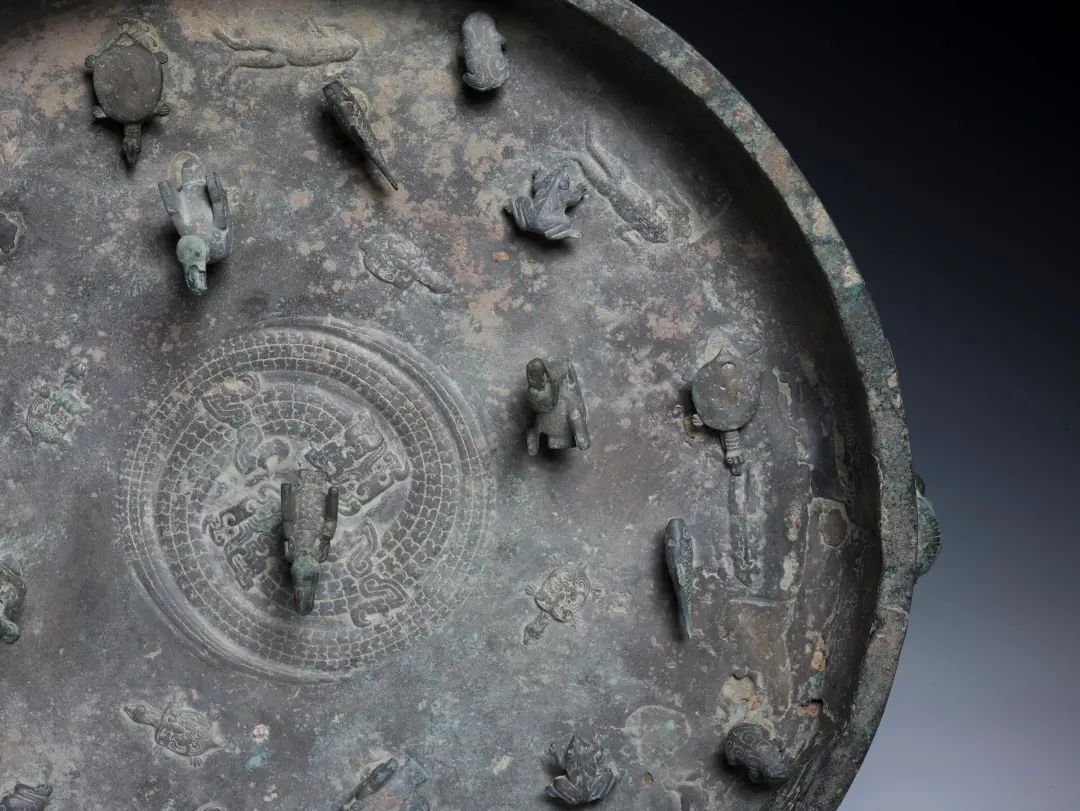 盘上饰有鸟、龟、鱼、蛙等多种动物