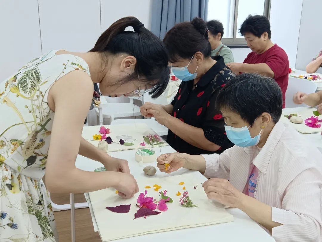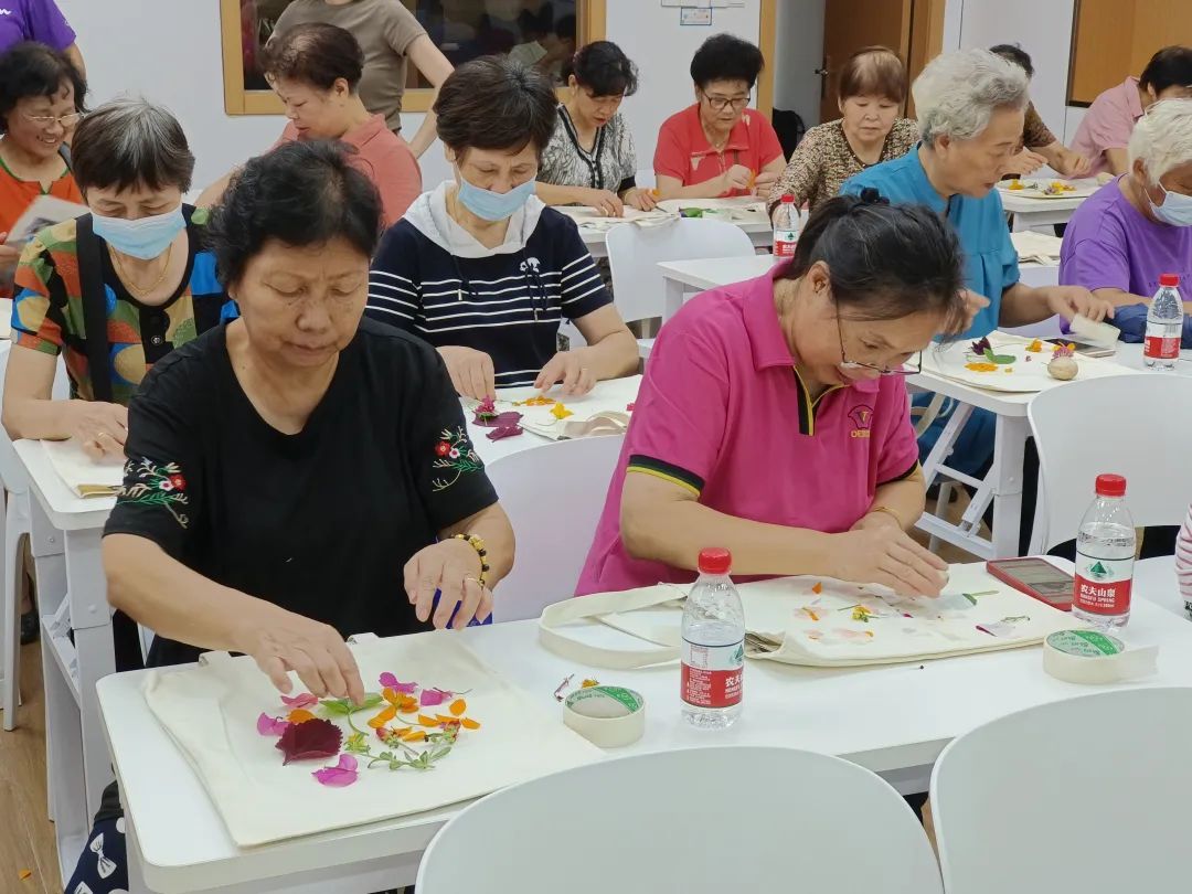 眼下虽然已是夏末秋初,但公园里花草依旧葳蕤,渲染出五彩斑斓。三角梅、石竹、白三叶、紫叶酢浆草、花叶蔓长春……上海农林职业技术学院的志愿者们带来了不少时鲜花材,现场教授居民非遗拓印技巧。志愿者们带着大伙儿布置好花叶构图,随后用鹅卵石轻轻捶打花叶,拓印到布包上。“没想到身边的花花草草也能‘拓印’,印在包上好看又有趣!”看着拓印完成的新作,南龙潭小区居民费建华兴奋地告诉记者。