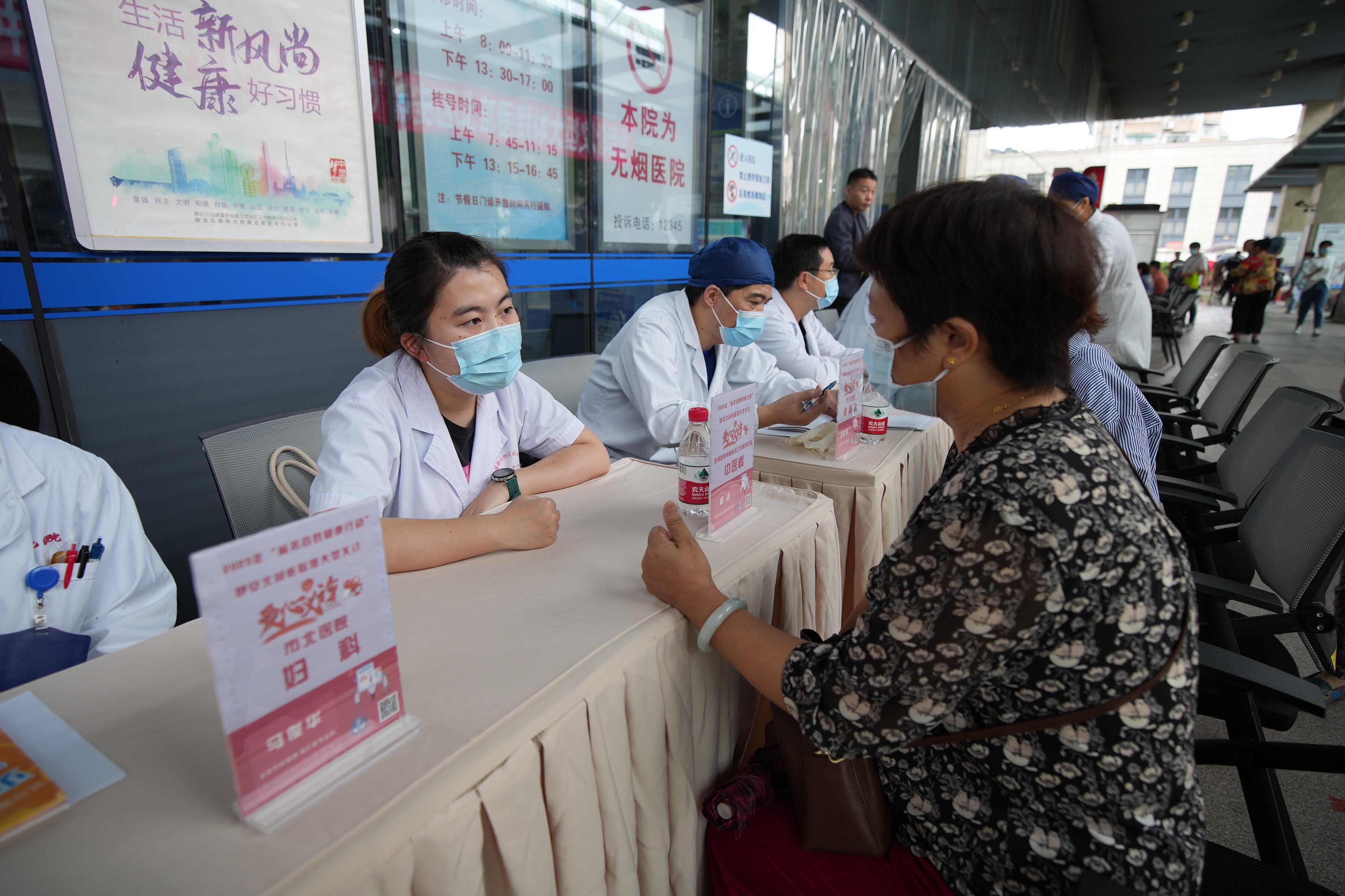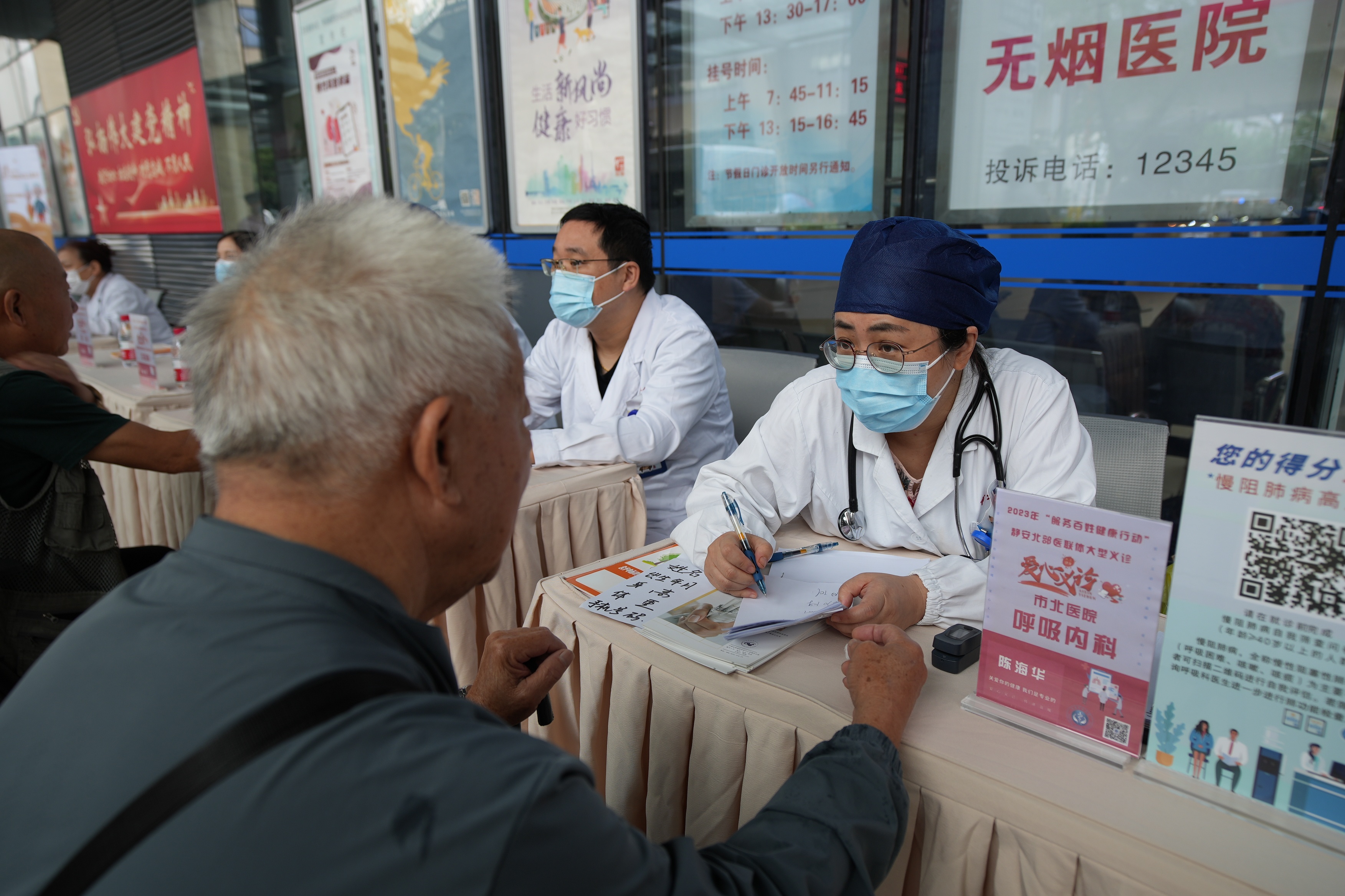上午9时,在位于市北医院门诊大厅前的义诊现场,来自静安北部医联体成员单位的医师们逐一解答前来咨询的社区居民的健康问题,针对大家不同的情况,叮嘱其日常生活饮食注意事项,并给予健康指导。