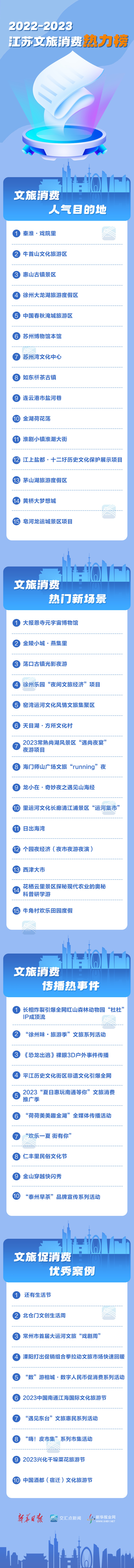 新业态、新场景、新亮点,持续释放文旅融合的独特魅力。9月22日,第五届大运河城市文旅消费论坛在苏州举行,“2022—2023年度江苏文旅消费热力榜”现场发布。这一榜单从“人气目的地”“热门新场景”“传播热事件”“促消费案例”4个维度评选出50个优秀项目。这些文旅融合的优秀成果,展现了江苏各地紧跟文旅消费趋势打造文旅产品新供给的创新实践,也体现出江苏文旅市场的强劲复苏势头。