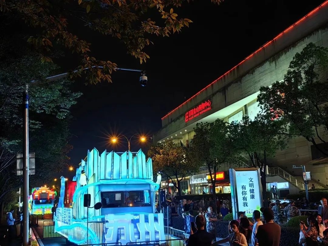 花车巡游是上海旅游节的一大亮点,暂别两年,上海街头流动的风景线再次回归。今天晚上,花车巡游来到了金山,在前京大道形成了一道靓丽的风景线。同时,2023金山旅游节也于今晚正式开幕,文化旅游与商业、农业、体育跨界联动,推出一系列丰富多彩的活动。 “三、二、一,启动!”在倒计时之后,上海旅游节花车巡游金山专场暨2023金山旅游节正式开幕。停靠在前京大道双向路段上的16辆花车逐一亮起了灯光,一辆辆造型各异、色彩绚烂的花车,在夜色的笼罩下显得格外美丽,吸引了不少市民驻足观看,合影留念。