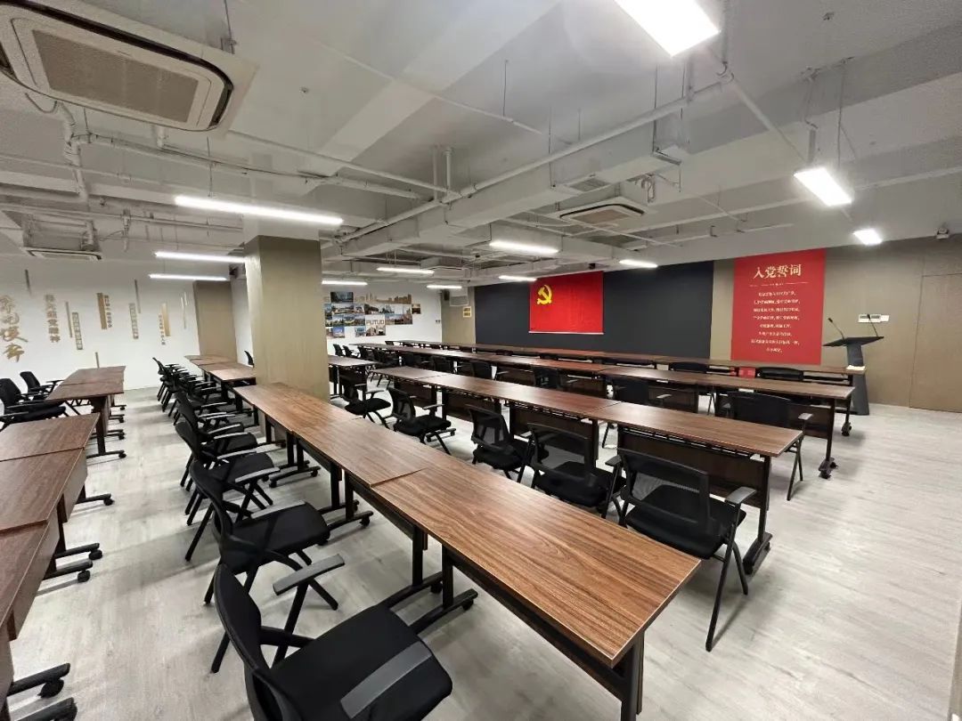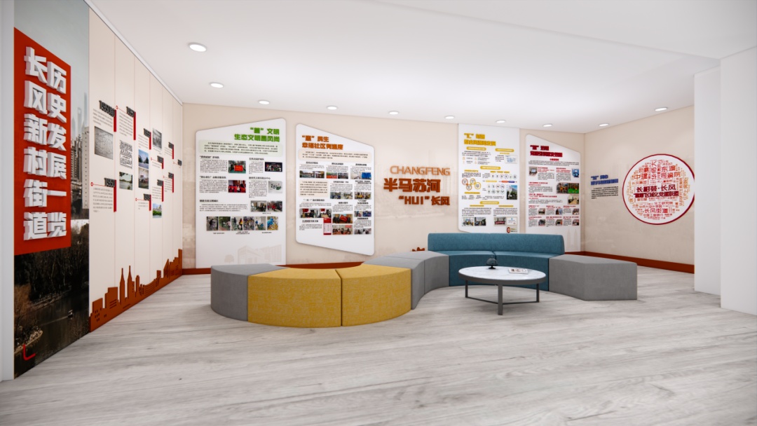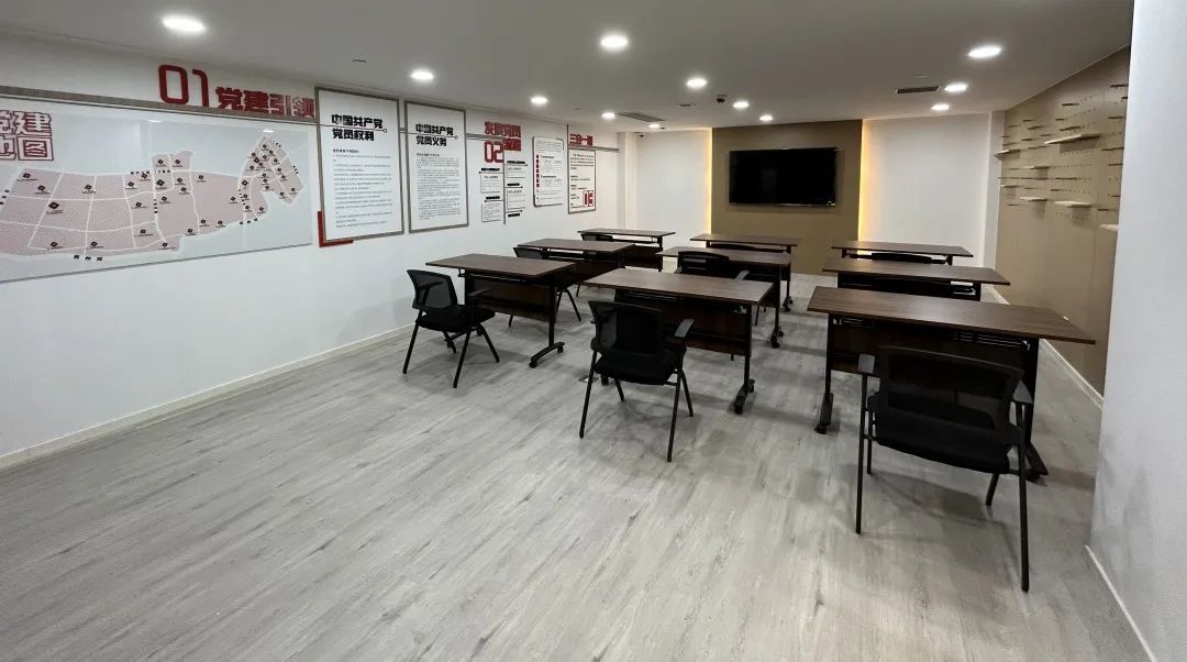 誓词教育厅:正前方是鲜艳的党旗和党员宣誓墙,房间的侧面是长风地标性建筑展示。面对着鲜艳的党旗,这里可以举行新党员入党仪式、老党员重温入党誓言等誓词教育活动。同时,通过预约登记制,这里也为机关党组织、居民区党组织和“两新”党组织开展“三会一课”、主题党日、社会公益等活动提供活动场所保障服务。