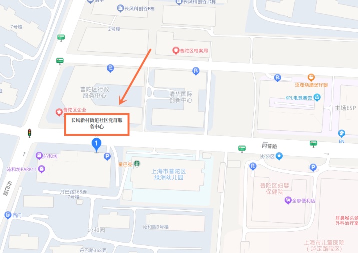 长风新村街道社区党群服务中心新址位于同普路593号沁和坊4楼,东面紧靠上海市儿童医院和普陀区妇婴保健院,南面和西面是沁和园及中海紫御豪庭等住宅小区,北面则是普陀区行政服务中心和清华国际创新中心,附近还有近铁城市广场、长风科创谷广场、桃源π等大型商业综合体。乘坐地铁13号线、公交846、766、67、216等可到达。