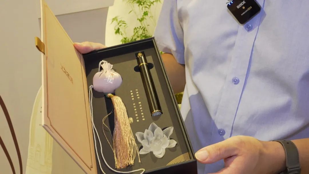 整个礼盒以莲花为主题,包括一管沉香、一个莲花造型的香插和一个粉藕色的莲花主题香囊,体现‘心静则安’的中医养生理念。”