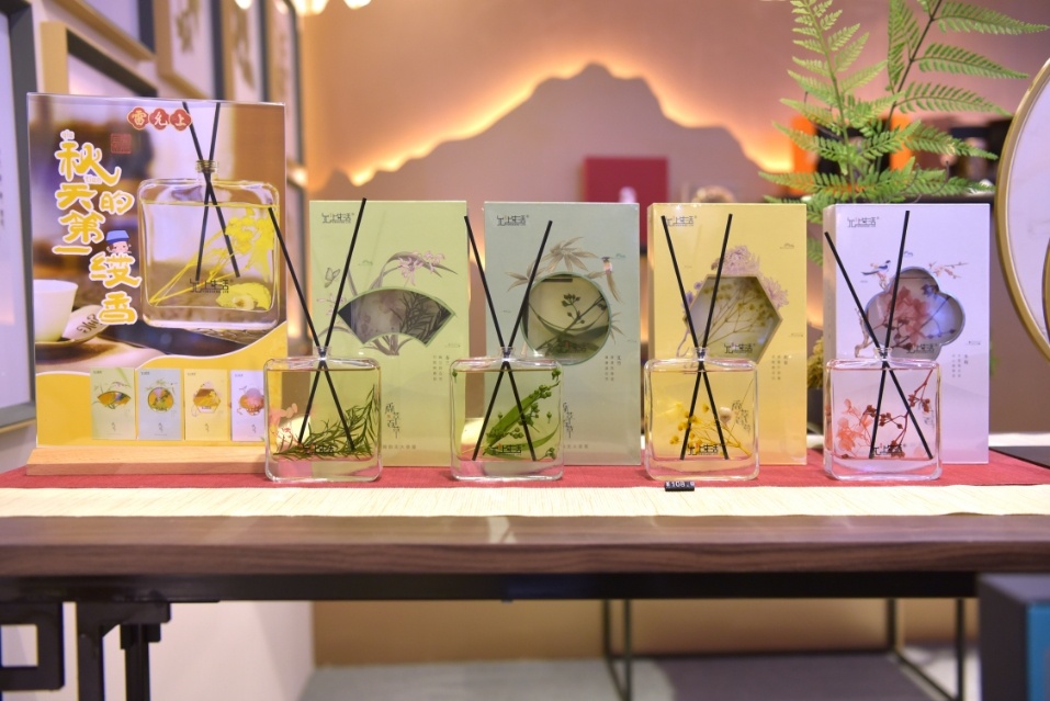 春兰、夏竹、秋菊、冬梅,四时四景。雷允上西区在老字号博览会上首发的“四十雅韵无火香薰”系列产品以传统养生理念中的四时顺养为创意核心,再结合“梅兰竹菊”四君子,提取植物精油,经过调香配制,让四季的芬芳味道随藤条慢慢扩散而出,还能透过小小的玻璃瓶观赏草本植物的形态之美。