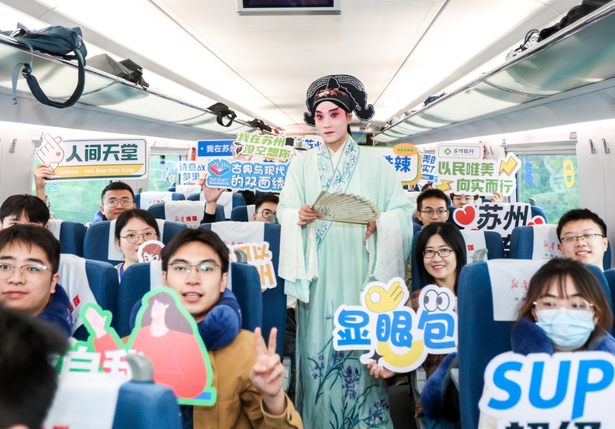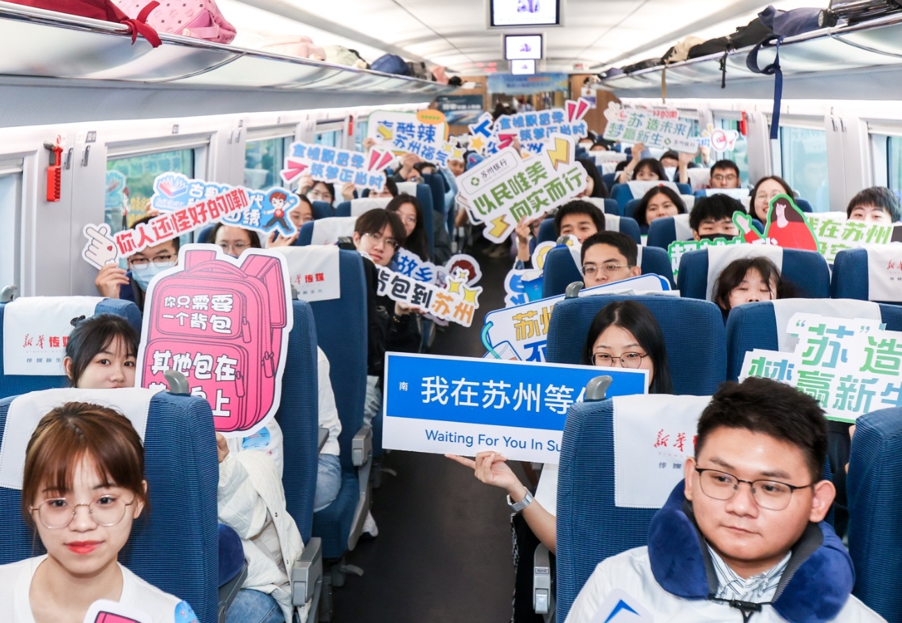 2023年秋季“校园苏州日”活动,苏州首次包下高铁车厢开通“高校引才专列”,承包学子往返车票和全程食宿,实打实践行“你只需要一个背包,其他‘包在苏州身上’”的承诺。