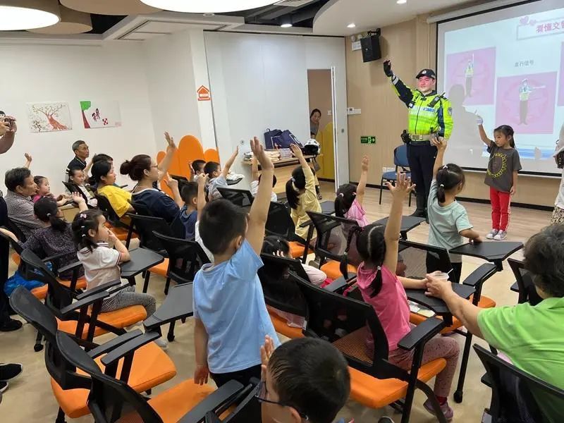 在两位交警叔叔的演示下,小朋友们还学习了交通指挥的手势并认识了常见的交通标志,活动内容丰富有趣,孩子们十分投入。