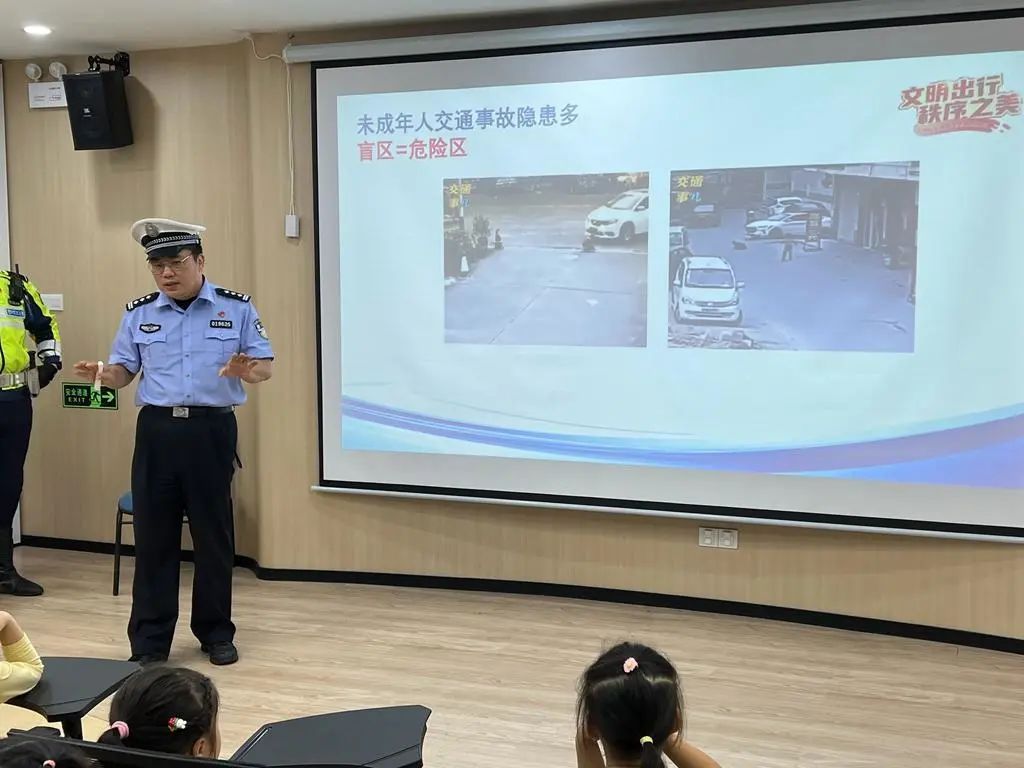 课堂上,交警叔叔利用各种案例动图,带着小朋友们了解了许多在路上容易受伤的情况,如:进入大车视野盲区、不正确地过马路、多人同骑一辆电瓶车等。通过循循善诱的讲解,多次强调重视道路安全的重要性,家长与孩子们都听得十分认真,时不时拿出手机进行拍照记录。