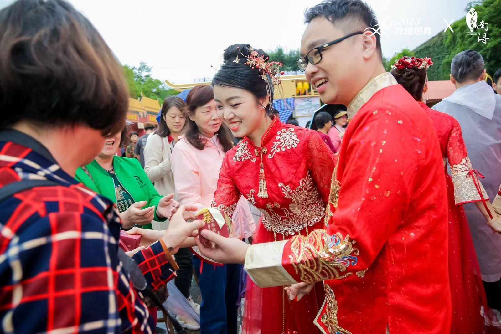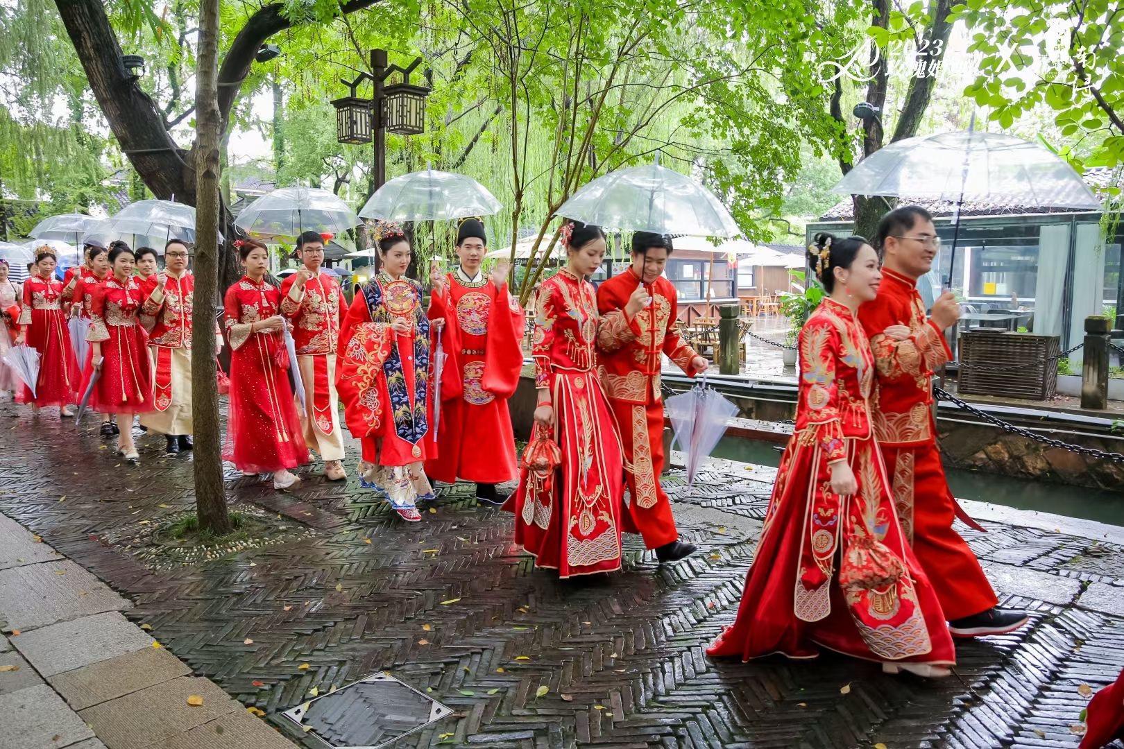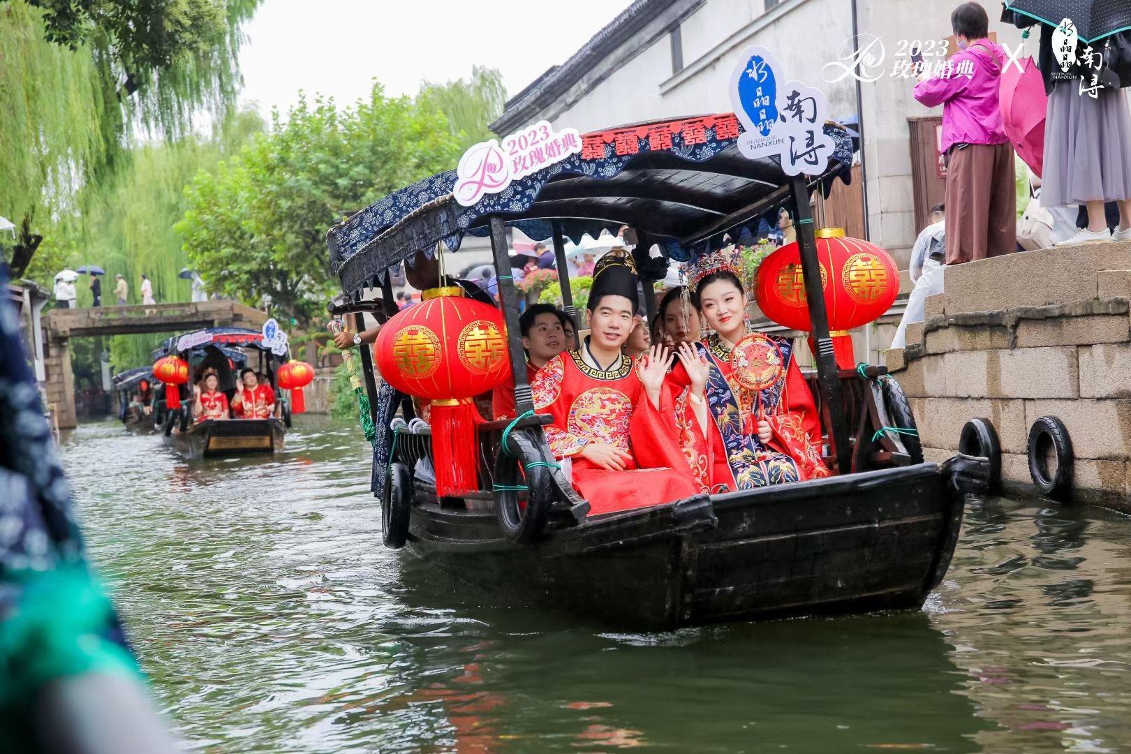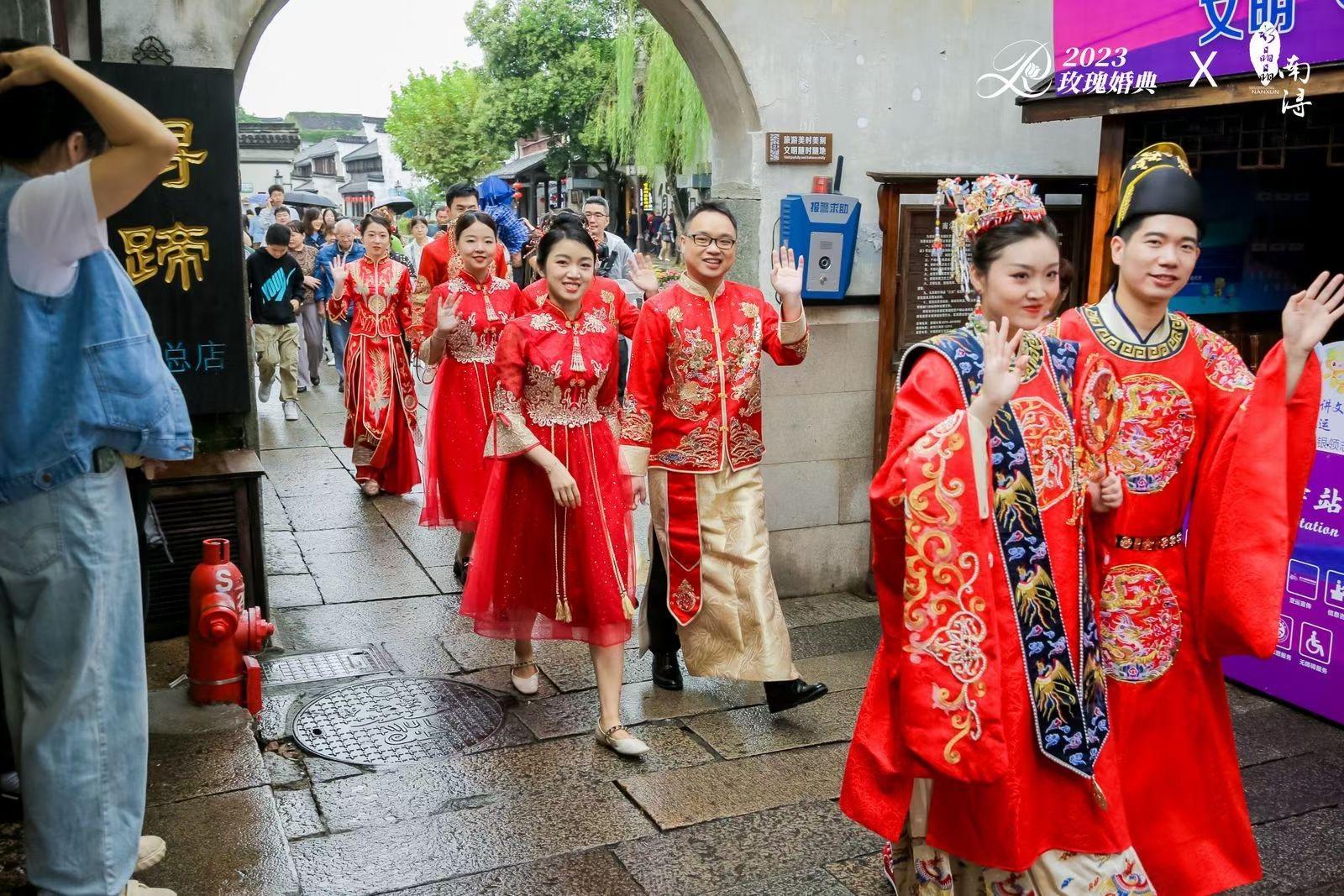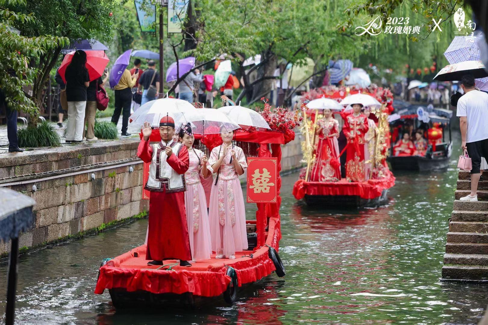 当天,小桥流水间,一艘艘木船载着身着喜服的新人悠悠驶来,体验了一场水乡特色的民俗婚礼,更是吸引众多游客前来观赏和拍照。