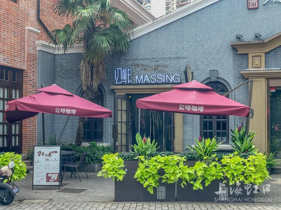 在老电影咖啡馆区域,老电影咖啡馆围栏采用挂壁式的小品花景来进行点缀,体现居家、亲和还有小清新之感,也与对面多伦路100号的D.D咖啡形成遥相呼应之美。