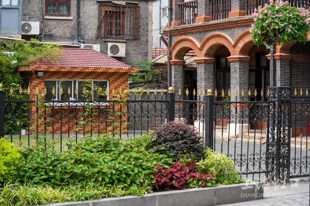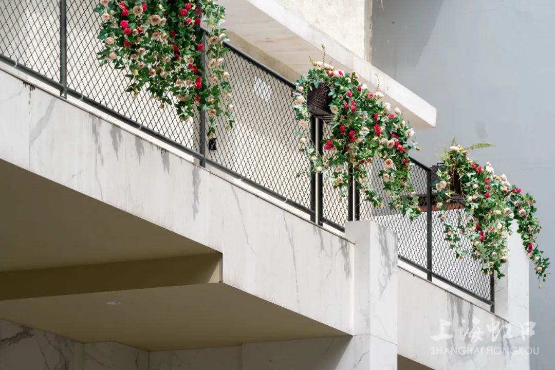 沿线老建筑下也摆放上了花篮,不过,区别于路灯上悬挂的粉色系花篮,这里基本以绿色系为主,搭配复古的墙面及地面,更加彰显出多伦路的沧桑与历史变迁之感。