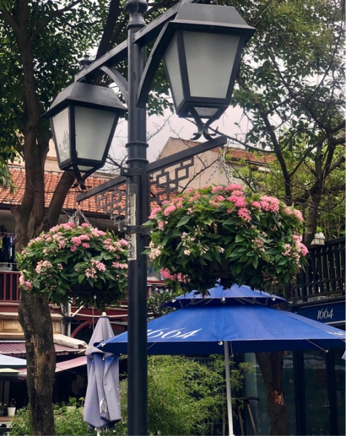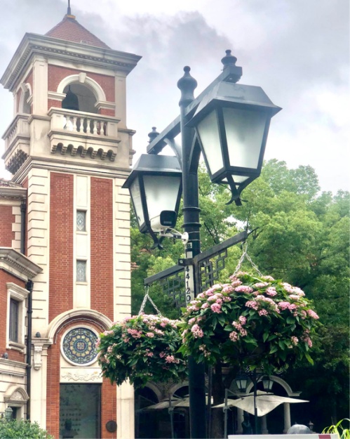 路灯上挂起了花篮,娇嫩的粉色小花铺满绿叶,让多伦路倍添温馨。