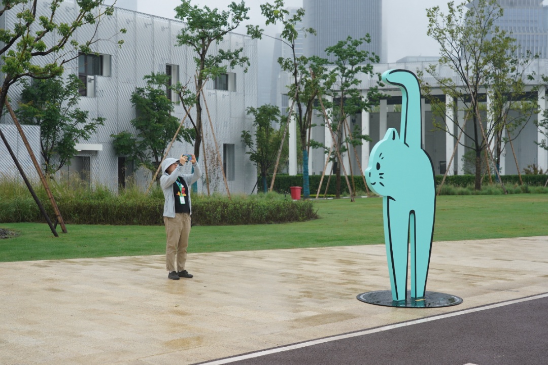 在淀浦河北岸的白猫主展馆也是本次艺术季的一大亮点。建筑改造保留了原白猫洗涤剂厂库房的主体结构和大部分外立面原貌,并对内部空间进行翻新以满足展览的需求。外部空间的设计从场地要素出发,最大程度地保留原生植物,确保外部动线可以顺畅地到达各层展区,并满足观众停留观景的需求。而室外一只高达6米的“白猫留声机”装置也着实吸引眼球,并与建筑相呼应。艺术家Tango表示:“由于上海具有留声机发源地的历史背景,因此设计的这只白猫戴上了伊丽莎白圈就像留声机的喇叭,如果它在玩唱片的话,就天然构建了一个留声机的形象。”Tango告诉记者,他喜欢做的就是能够在公共空间让路过的人看到艺术作品时能感到开心,感受到它们带来的感染力。