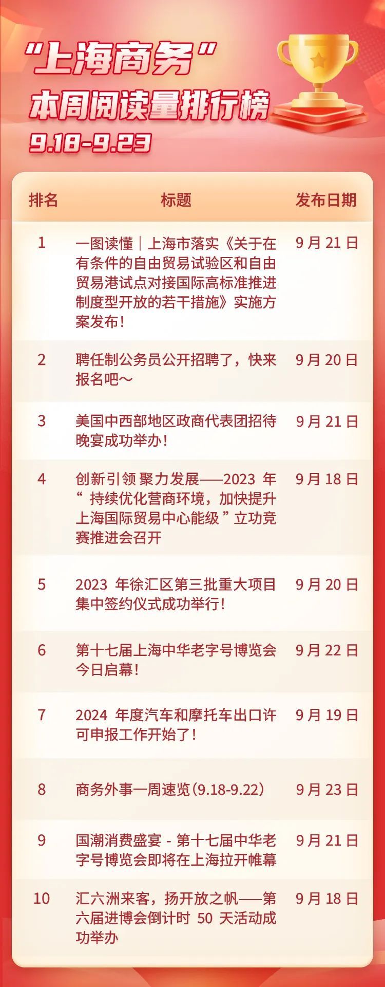 上海市聘任制公务员公开招聘!市商务委委招聘外事高级翻译1名~报名时间为9月21日至27日,快来和小商做小伙伴吧!美国中西部地区政商代表团招待晚宴成功举办,今后将继续推进两地经贸交流合作。“持续优化营商环境 加快提升上海国际贸易中心能级”立功竞赛推进会召开,表彰先进,交流经验。2023年徐汇区第三批重大项目集中签约仪式成功举行,进一步优化区域营商环境,提升服务能级,吸引和集聚更多优质外资外贸企业,为区域经济高质量发展注入更多新动能。第十七届上海中华老字号博览会盛大开幕,展出面积近8000平方米,首发“老牌新品”278个,组织发布活动25场,为消费者奉上一场国潮消费盛会!2024年度汽车和摩托车出口许可申报请在9月28日前完成线上提交。