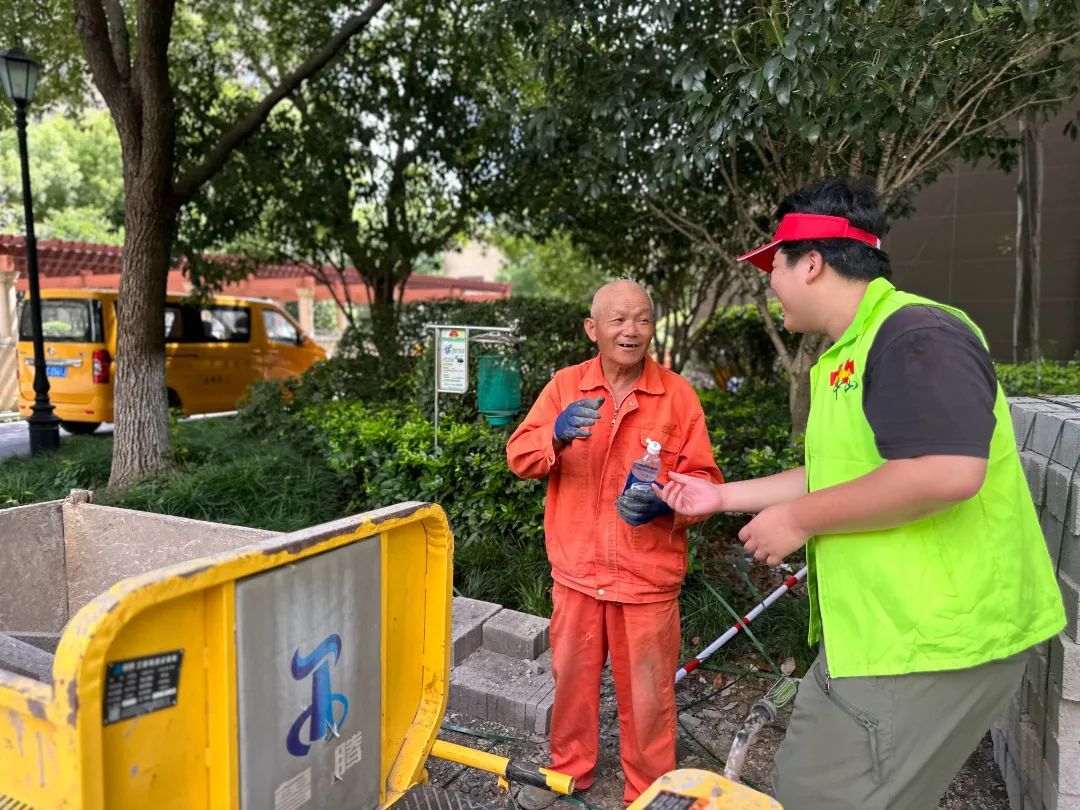 施工期间,居委会工作人员巡查时常会和施工人员聊两句,询问施工进度,道一声“辛苦”。恰逢高温酷暑,黄渡浜居委会开展“夏日送清凉”活动,志愿者们为施工人员送上冰凉的饮料。