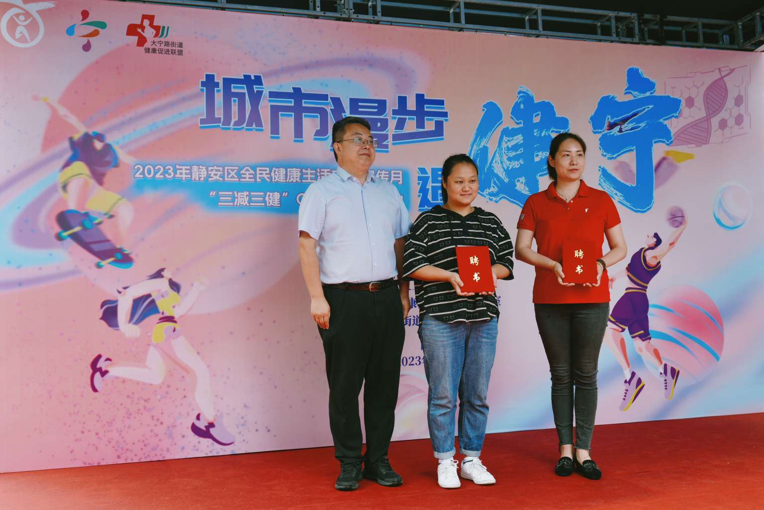 市卫生健康委健康促进处相关负责人为大宁路街道体育指导员和彭浦新村街道食品药品科普站代表颁发“全民健康生活方式指导员”聘书。