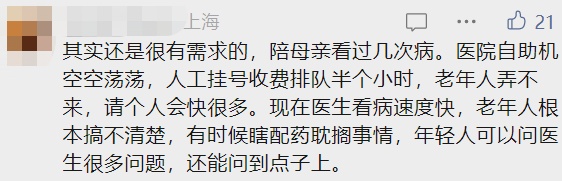 上海市民奚小姐表示,这个新型职业,帮助她解决了大难题。奚小姐的父亲得了肺结核,需要一个漫长的治疗周期。“我自己不能经常请假陪伴看病,所以就找了一个陪诊员。有一次,医院的CT取号机坏了,只能自己去排队,他让我爸在一边休息,自己站着排了一小时的队,做好后还把我爸送出医院,叫出租车回家。”