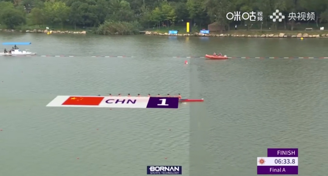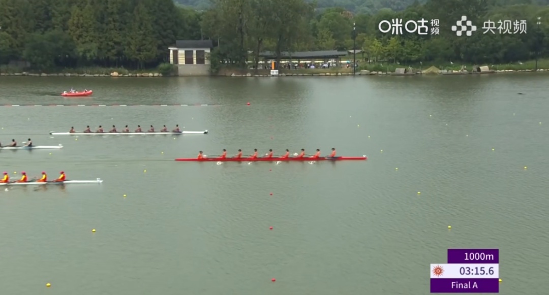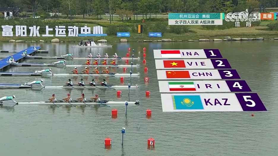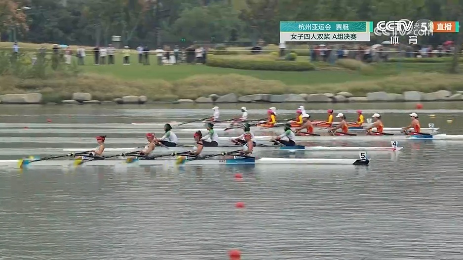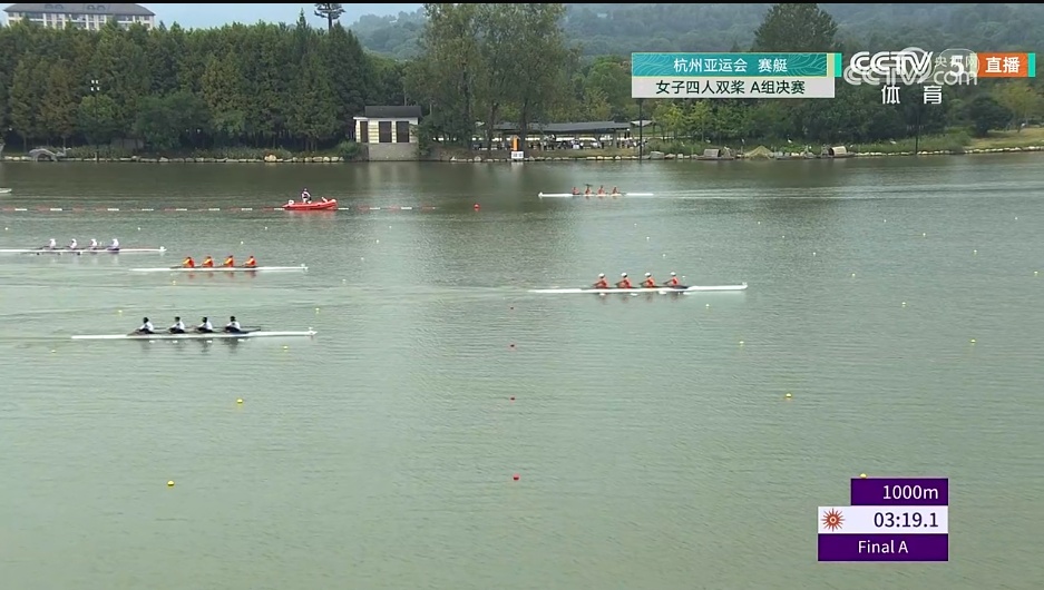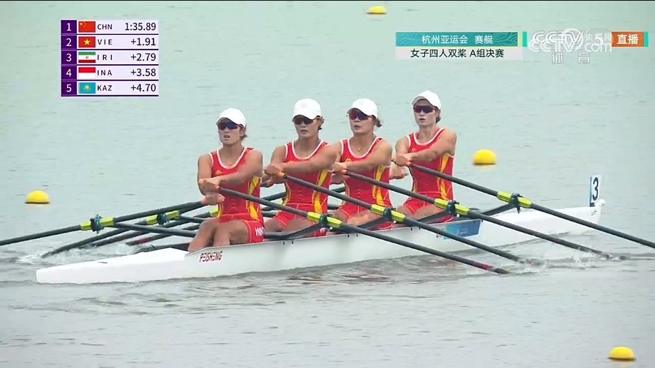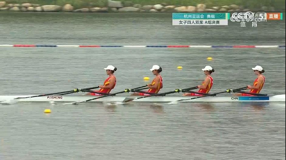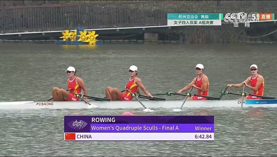 在杭州亚运会赛艇项目女子四人双桨决赛A中,由上海运动员张灵、陈云霞搭档吕扬、崔晓桐组成的中国队以6:42.84的成绩夺得金牌!