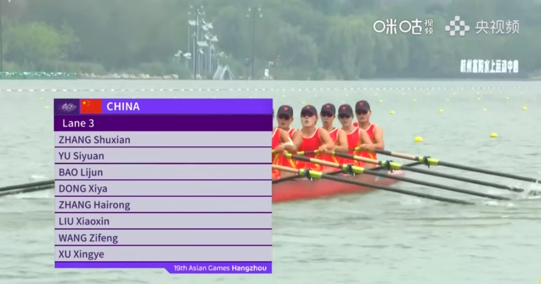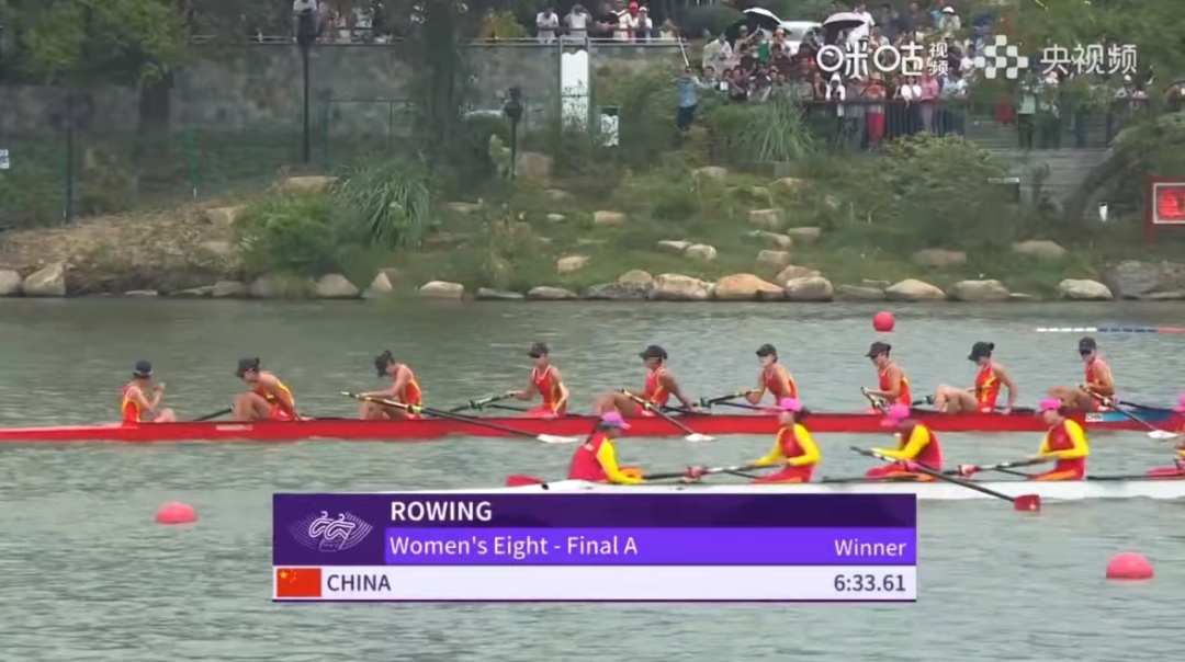 在杭州亚运会赛艇项目女子八人单桨有舵手决赛A中,上海运动员张书贤、张海蓉与队友搭档,以6:33.61的成绩为中国队再添一金!