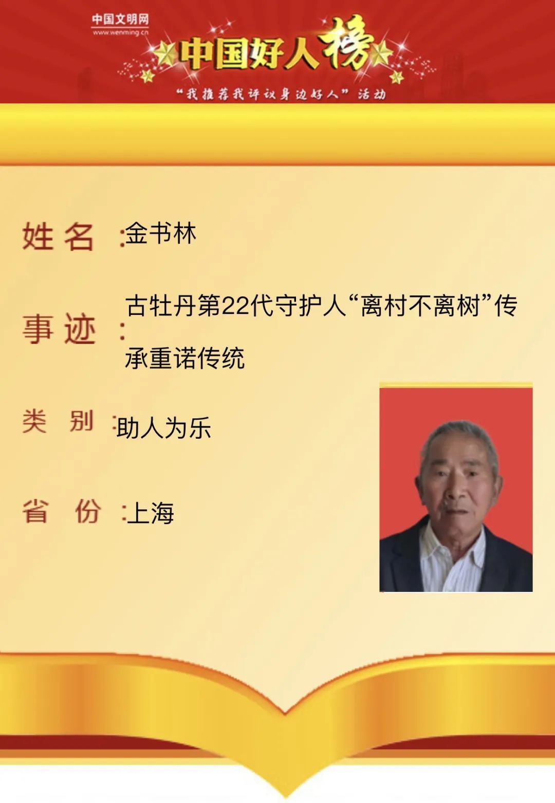 好消息! 近日,中央文明办发布 2023年第二季度“中国好人榜” 奉贤区金书林成功当选 助人为乐类“中国好人”! 今天,就请大家跟随小编 再一次走近“古爷爷”金书林的故事 人物故事 金书林,男,1941年2月生,中共党员,上海市奉贤区南桥镇吴塘村“粉妆楼”第22代守护人。“粉妆楼”古牡丹是明代书画家董其昌所赠,金家世代视为珍宝,一直用爱接续守护40余年。1996年至2023年,已积攒了十余本访客签到簿,累计记录访客10万余人次。如今,金书林的儿孙们也已加入守护人队伍,将这份近500年的守护一代一代传承下去。金书林曾荣获“上海市五好文明家庭”等荣誉。