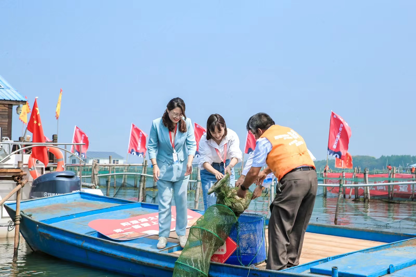 随着一声令下,多艘船只从岸边出发,向湖深处驶去,大概十五分钟的时间,缓缓地停靠在湖中的围网处。在围网内的小舟上,蟹农俯下身子,拾起湖面上标识物,众人屏息注视,蟹笼缓缓被拉出水面。“出来了,出来了!”随着众人的欢呼,今秋的“第一篓”大闸蟹出水。蟹网上,攀着一只只体肥爪壮的大闸蟹,彰显着一个丰收的季节已经到来。