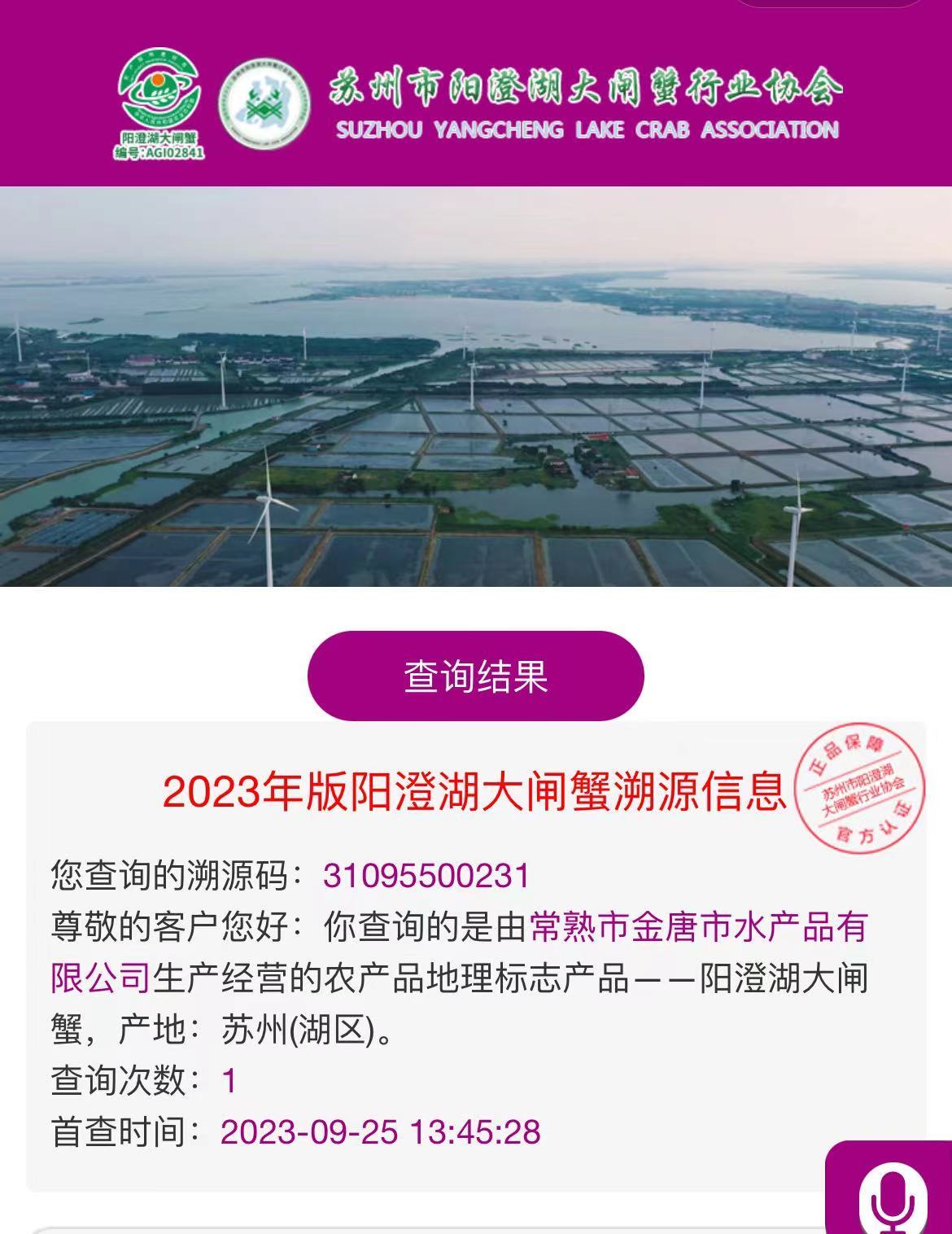 值得一提的是,标识今年首次采用了AI点码防伪技术,为消费者提供了准确、便利的识别方式。记者拿到一个已使用的紫红色防伪专用标识。扫描其背面的二维码后,弹出专用的扫描页面。再次用手机对准标识,显示出2023年版阳澄湖大闸蟹溯源信息,上面标着:您查询的溯源码:31095500231;产地:苏州(湖区);首查次数:1;首查时间:2023-09-25 13:45:28。