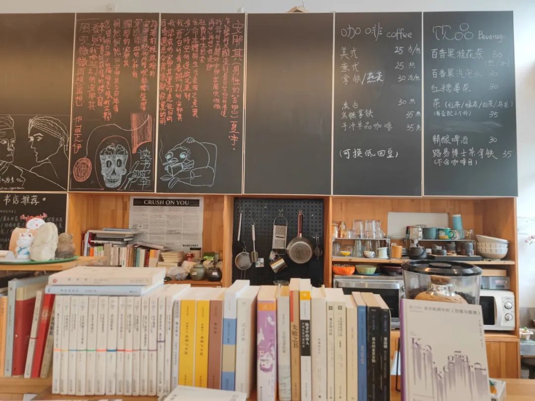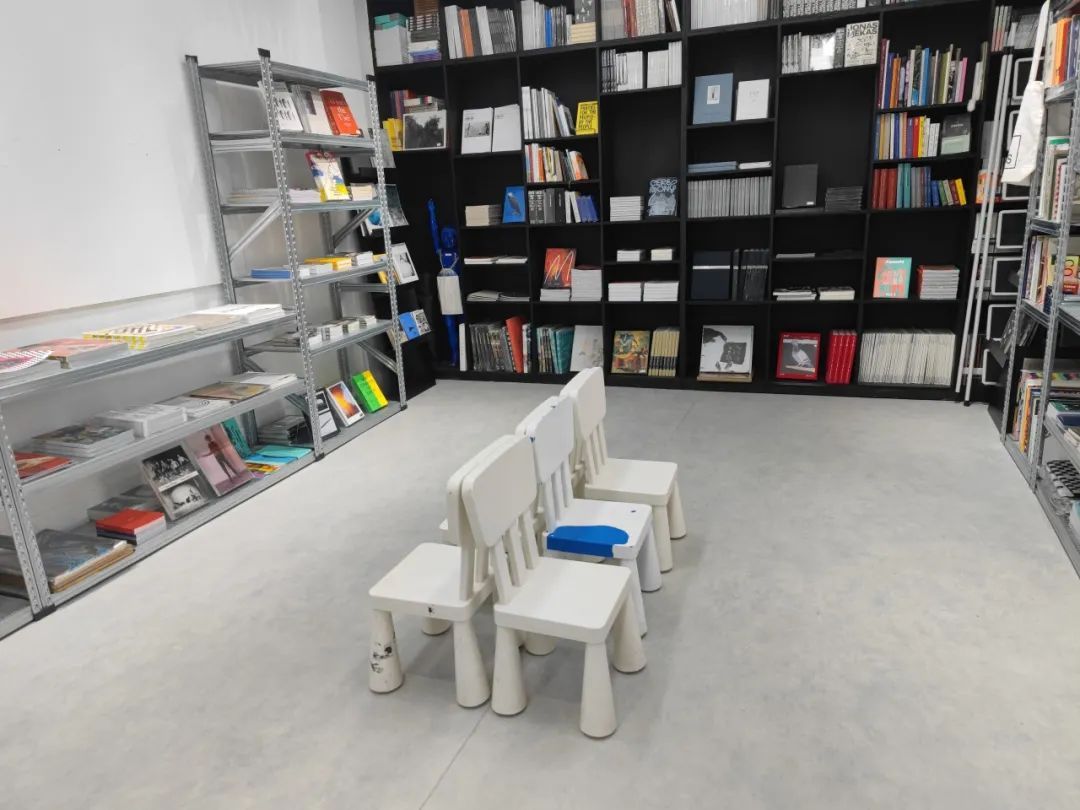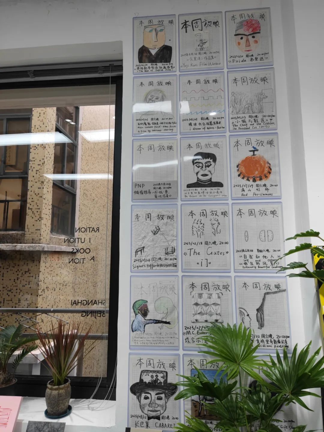 面向室外的墙面新添了鲜艳的涂鸦,店员仍在继续认真地粉刷——第一眼便能看到“PNPRESS”。PNPRESS于2021年的夏天搬到园区,最开始是“前店后厂”模式,同时拥有书店和版画工作室,版画制作的部分后来迁址至北京。这次租下隔壁办公室后打通了内部,最大的改变是扩大了面积。门口的涂鸦,或许也能一定程度上改变书店“暗门难寻”的境况,很好地成为来往书友的路标。走进书店,以墙为界,一边是图书和观影区,一边是小小的展览空间。陈列的图书基本上是以外文书为主的艺术类出版物,涵盖人文、社科、历史、摄影等艺术相关领域,同区域还有PNPRESS线下社群的创作者们使用相关媒介输出的美术作品。展览空间暂时没有开放,据悉,这是因为部分作品正在其他地方展出。在PNPRESS有两件不能错过的事情。书店内绝大多数书籍可以翻看,并设有专门的“绝版书架”——这些书已经买不到了,甚至书店也不卖,就摆了两排让人梦回童年的小板凳,让你把书店当阅览室。如果有想要交换的艺术类旧书,你还可以在交换车上试试运气。墙上的“本周放映”海报也称得上书店最美好的风景之一。每一张海报都是PNPRESS的小伙伴根据观影的印象画出来的抽象画,可爱又不失灵气。店员告诉“宁宁”,电影一般在周六晚上免费放映,类型以艺术类纪录片为主,通过微信公众号在周三发布观影信息。如果没有时间线下观影,也可以通过腾讯会议参加线上放映。简而言之,这是一家很有个性的书店,他们甚至在这次整修中以4:1的比例否决了新增咖啡和饮品的提议!
