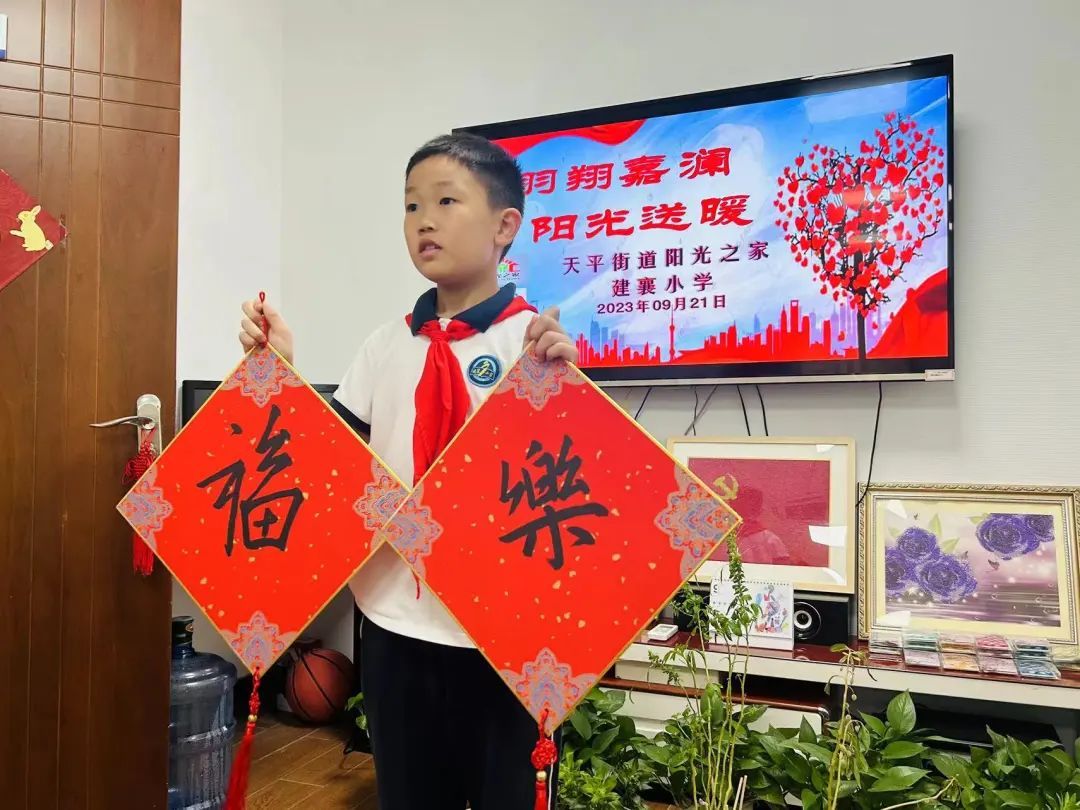 三年级小伙伴段俊宇送上了他的书法祝福,红底斗方的“福”“乐”二字隽秀挺拔,寓意美好;之前爱心义卖的部分善款化为“暖意融融”的保温杯,送到了每位阳光之家学员手中,而他们巧手编织的卡套也作为礼物回赠给了建襄小学的师生们。活动最后环节,大家一起分工合作,玩起了“动手又动脑”的科创手工。