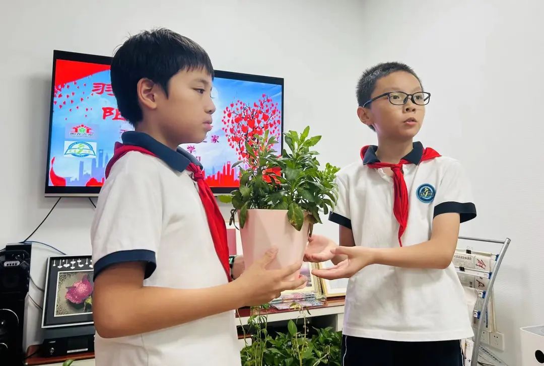 五年级的张文辰送上自己亲手培育的绿植,他告诉记者,从播种到育苗到看着它长大,这盆阳光菊是自己一手种植的,放暑假时还特地捧回家照顾它安然度夏,希望经过时间与爱心浇灌的植物,能给阳光之家的哥哥姐姐带来更多绿色、更多阳光、更多生命力。