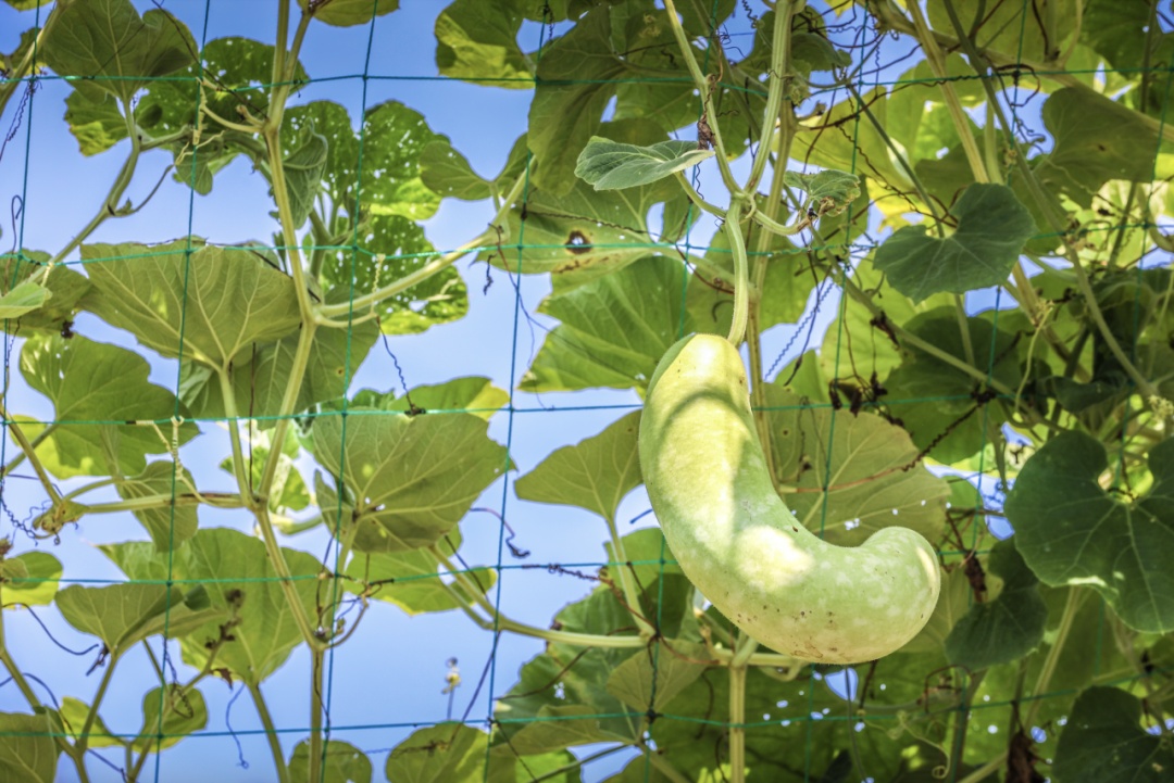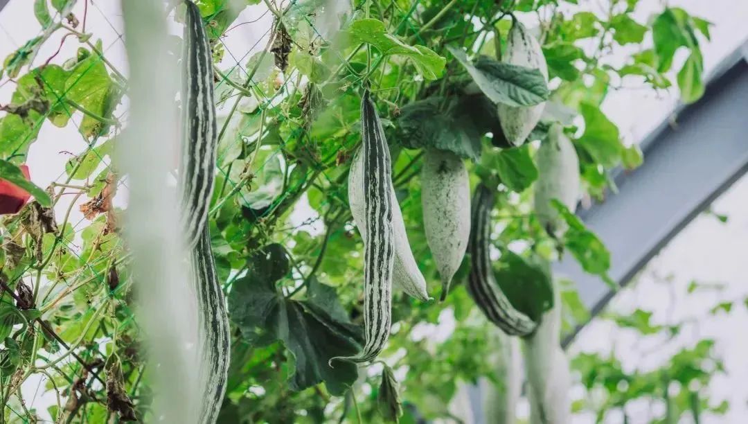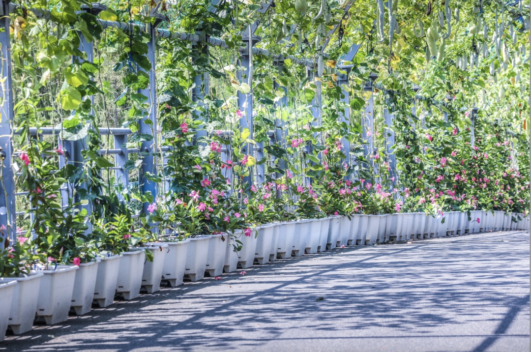 九月底迎来盛花期后,五座廊架与花桥也被多彩的蛇瓜、老鼠瓜和瓠瓜等花果装扮起来,茂密的藤蔓里满是丰硕精巧的果实,为辰山植物园更添了一份秋日丰收的浓情蜜意。