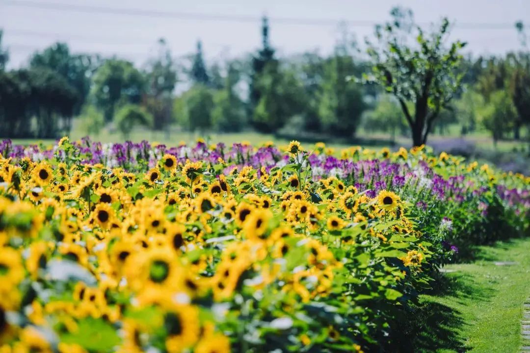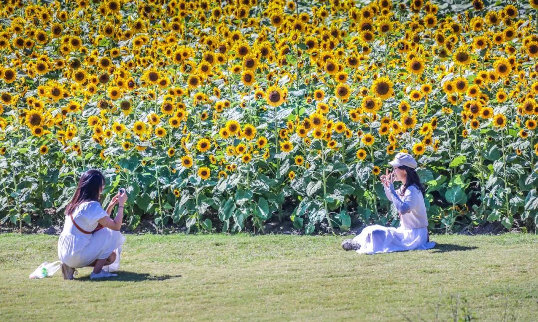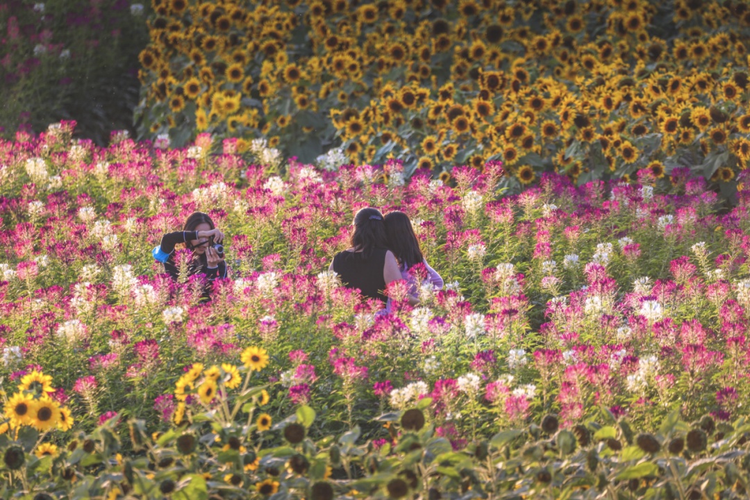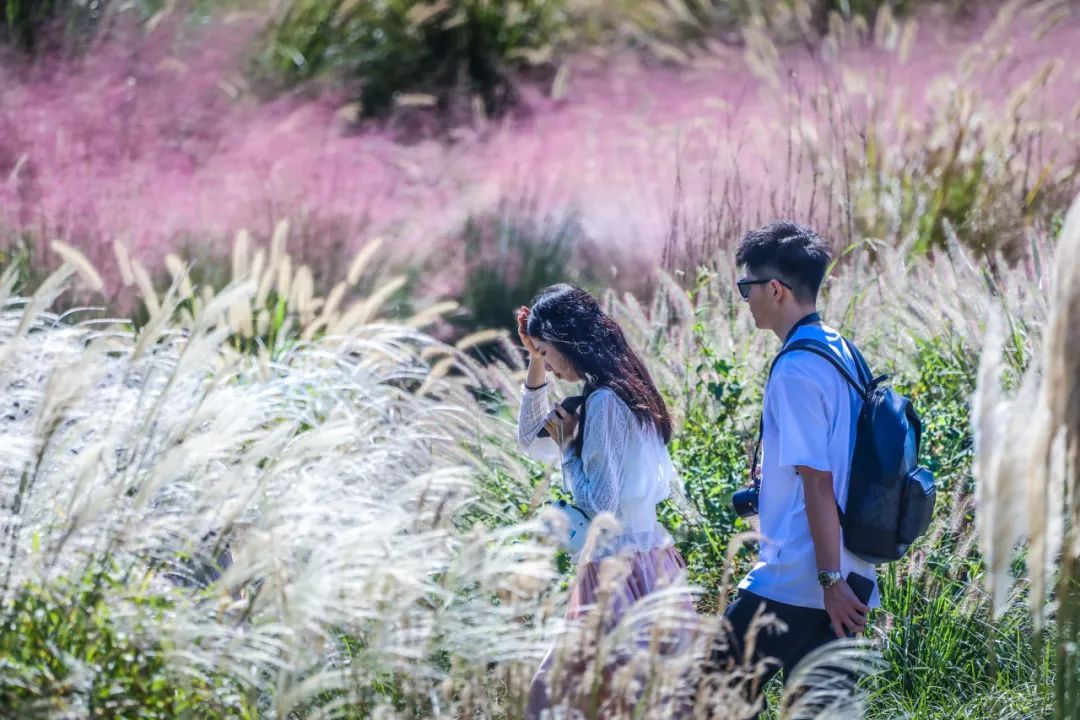 花海里绚烂夺目的向日葵竞相绽放,在金秋的阳光下与蓝天白云相映成趣,宛若一幅令人沉醉的秋日油画。粉黛乱子草也开得正盛,扑面而来的梦幻粉,让人仿佛置身宫崎骏的童话世界。微风拂过,花海中漾起层层金色的花浪,人们沿着小径漫步,穿越繁茂的花海,体验融入自然的闲适快乐。