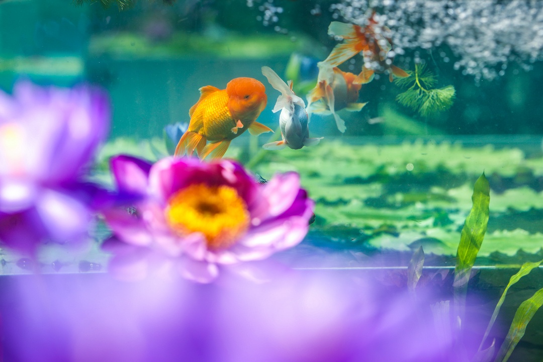 展区延用睡莲和观赏鱼的搭配展示形式,新增观赏草、观赏蔬菜等秋季植物,营造缸内小型生态意境,打造全新的夏花秋韵主题展区。