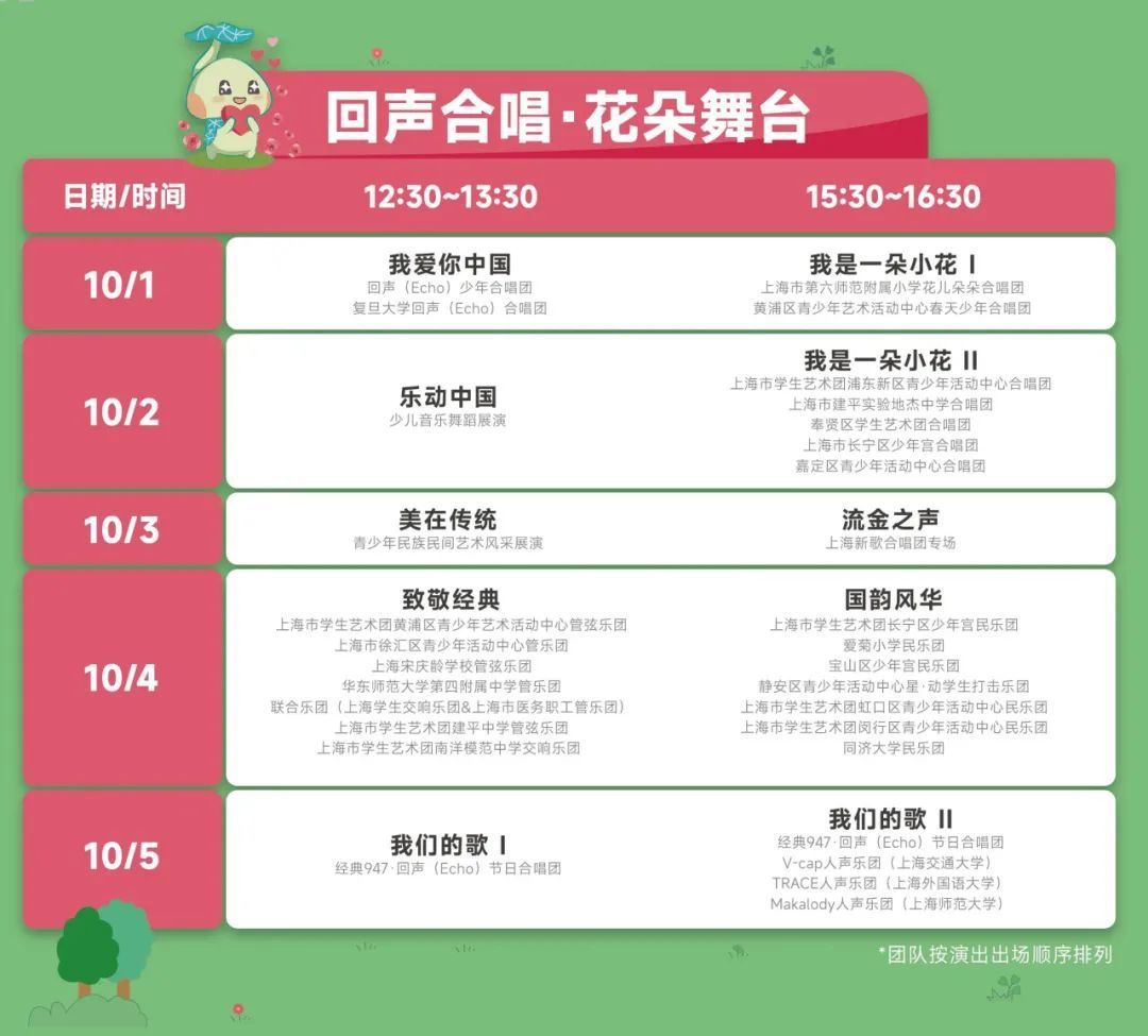 除了各合唱团即将带来的丰富合唱节目,花朵舞台还将倾情呈现几场特别的今秋限定演出,包括「乐动中国」少儿音乐舞蹈展演、「美在传统」青少年民族民间艺术风采展演与「我们的歌II」三支阿卡贝拉团体的演唱。
