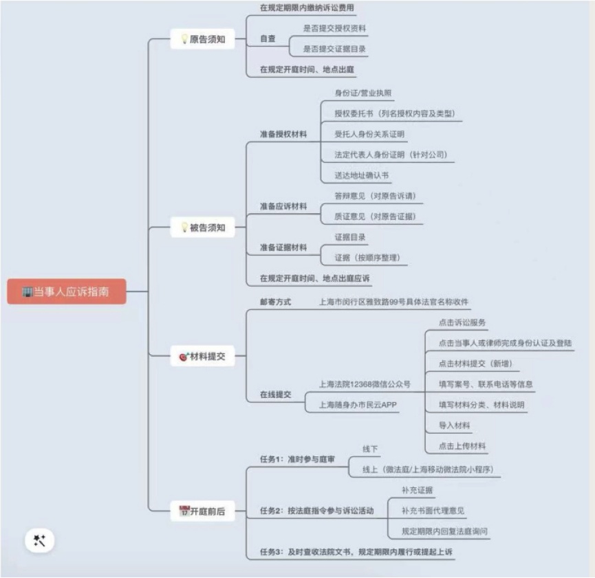 对于当事人频繁咨询的如何应诉、如何向法院递交材料等问题,上海法院曾经印发图文版的《当事人应诉指南》,技术部门也曾制作过当事人提交材料操作手册。这些诉讼指引都可以随诉状、举证通知书等材料一并电子送达给当事人,为他们提供相应的应诉指导。