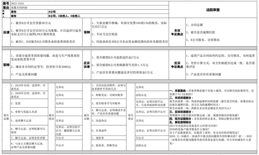 2.对于当事人人数众多、有多项诉讼请求、被告提起反诉或者双方证据材料繁琐等较为复杂的案件,可以通过excel表格罗列各方当事人意见,梳理案件争议焦点。