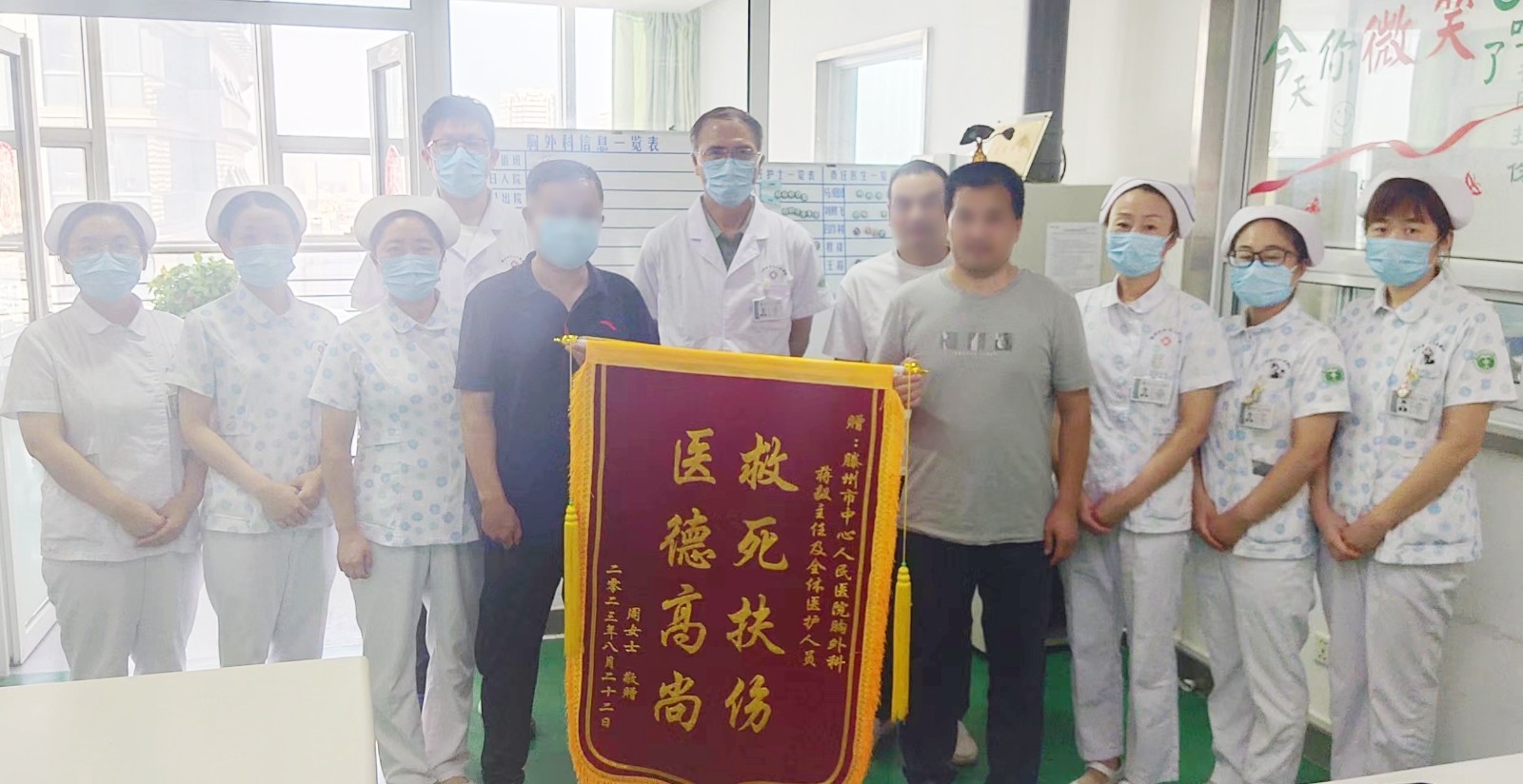 8月22日早,一患者家属将一面写有“医德高尚 救死扶伤”的锦旗送到滕州市人民中心医院胸外科护士站。