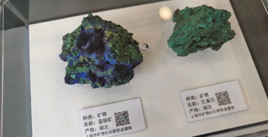 此外,现场还展示了难得一见的矿物,其中,蓝铜矿可做蓝色颜料“石青”,孔雀石可做绿色颜料“石绿”,在绘画中的使用历史悠久。现场工作人员告诉记者,“敦煌莫高窟壁画、中国十大名画之一的《千里江山图》、马王堆1号汉墓出土的彩绘帛画,都用到了蓝铜矿作为颜料。”