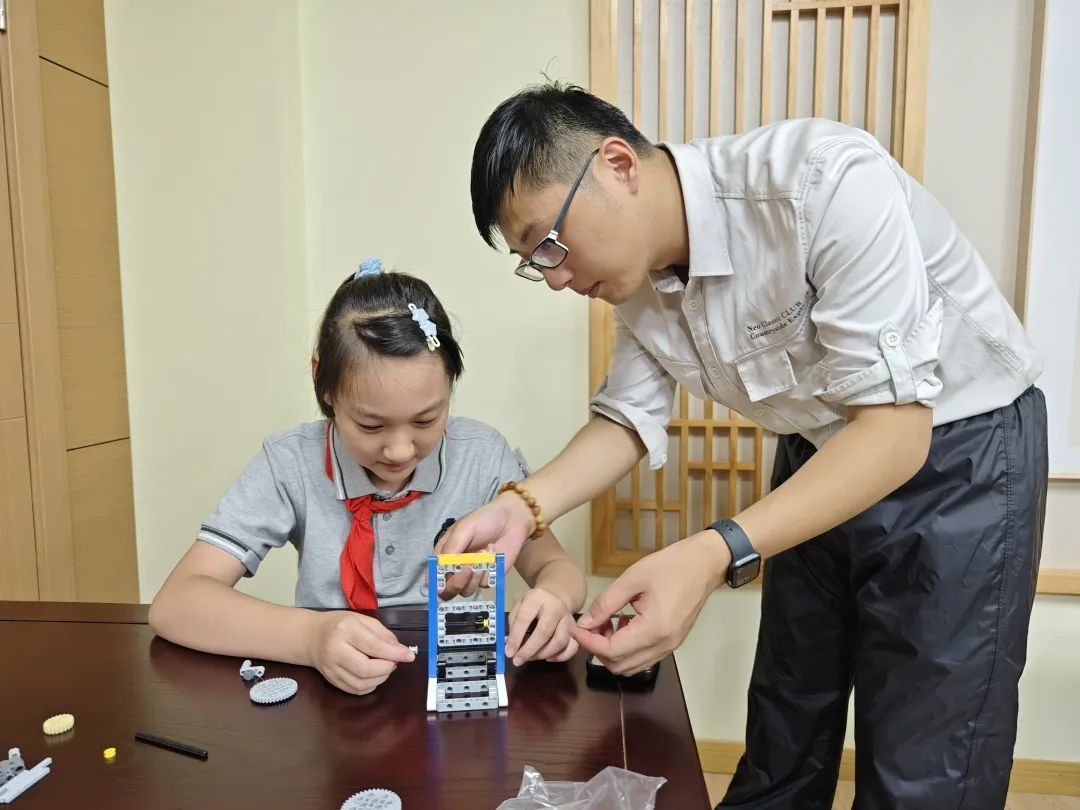 通过手工DIY,将一块块积木拼搭成形,手摇拨杆后,装置在齿轮的机械传动作用下旋转起来,不仅有趣好玩,也在寓教于乐中让小学生们提早接触到了物理知识。