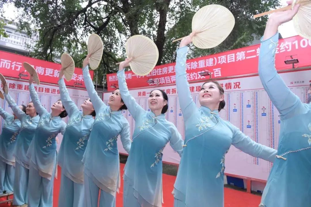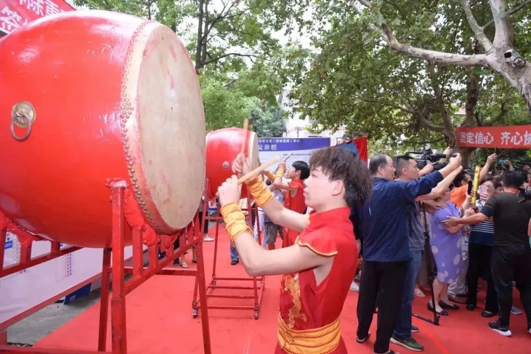 大批居民自发来到小区主干道,拿起鼓槌敲响代表凤南一村35栋楼全部同意的35个大鼓,现场锣鼓喧天、热闹非凡。项目推进栏“星星墙”前,两个立式大鼓敲响了盛世龙腾的中国鼓音,随后居民舞者们跳起了凤凰于飞的舞蹈,这场隆重的庆祝活动正式拉开了序幕。