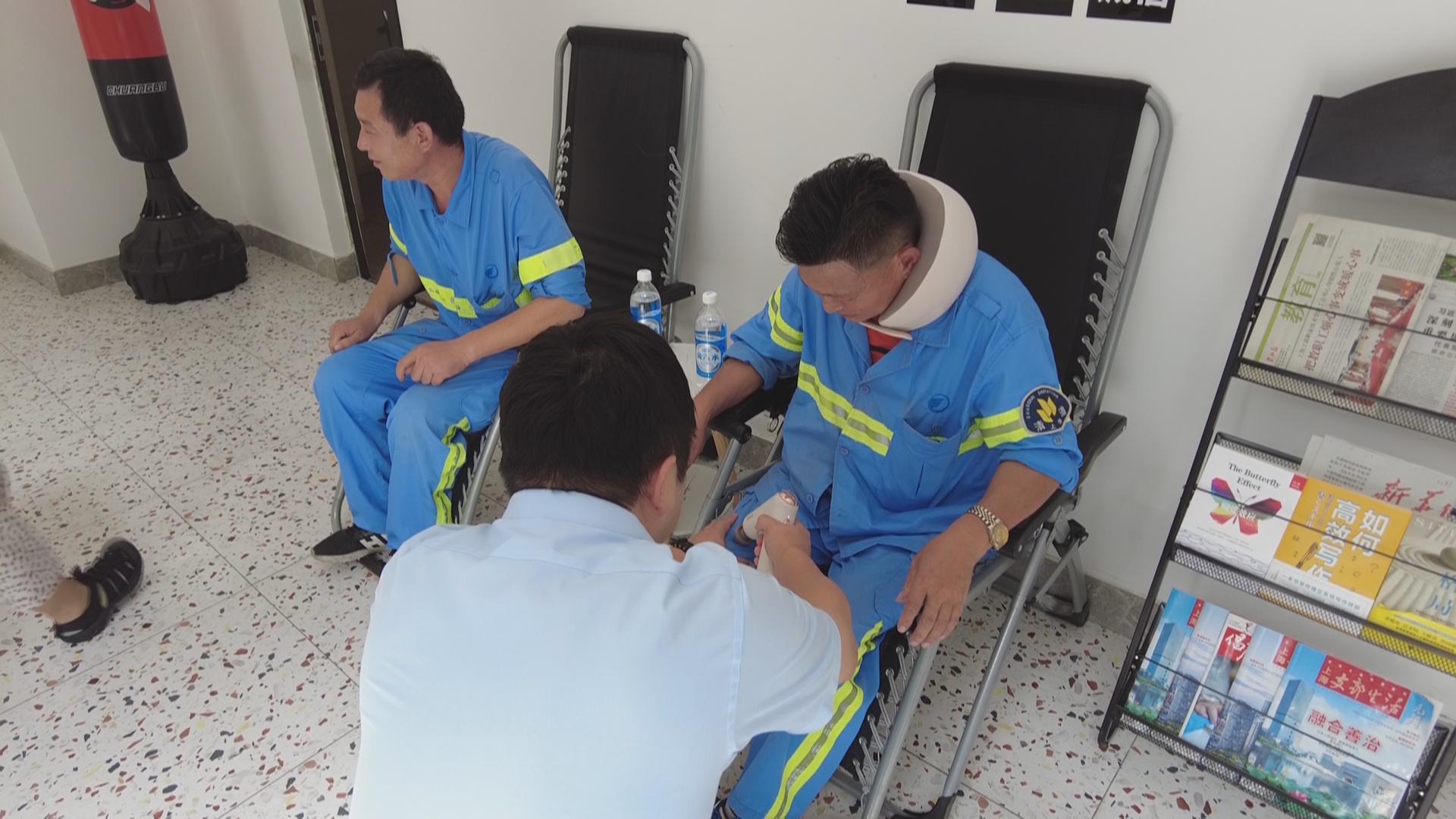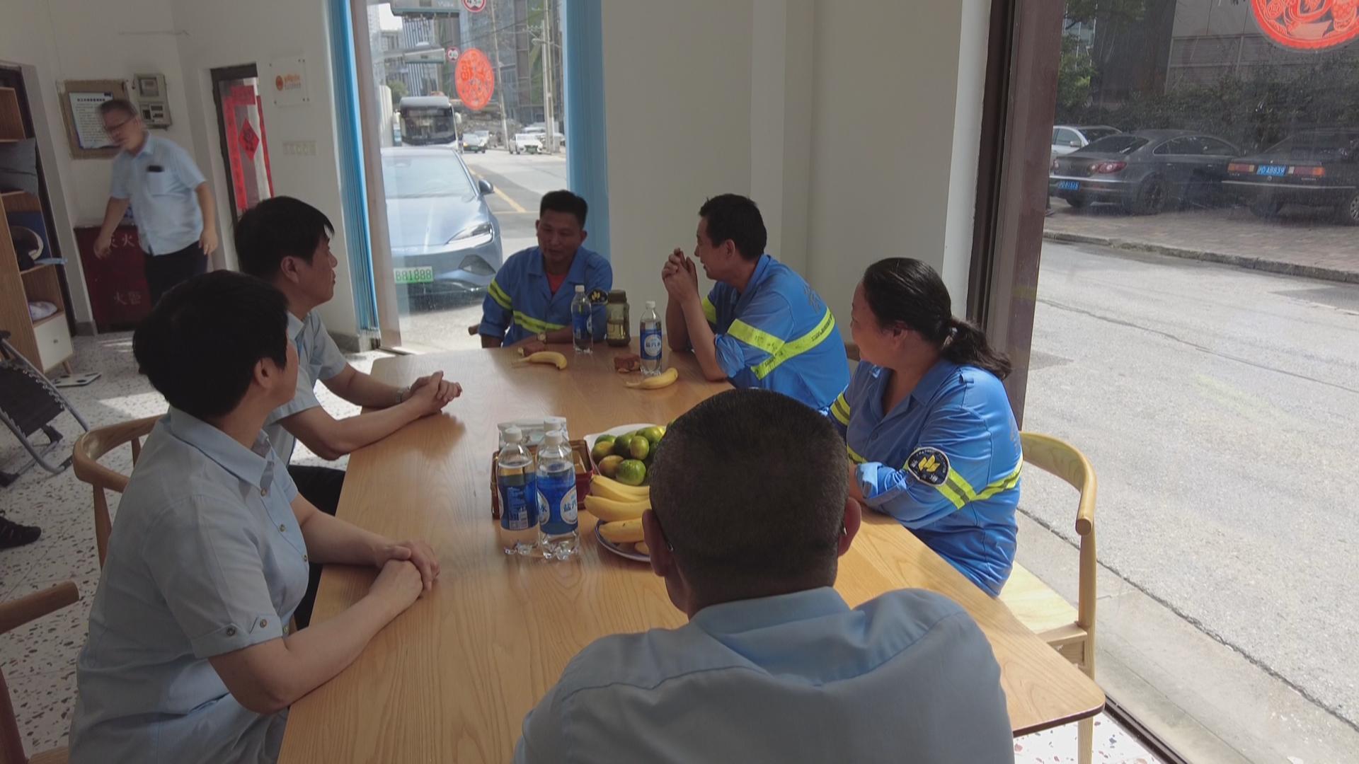 双节将至,趁着环卫工人在休息站里休息的时候,26路车队工作人员特地带来了月饼和水果,邀请环卫工人提前过节,感受一番节日的团圆。这个全新改造的休息站有着大大的落地窗,阳光洒落,窗明几净,还专门有两张大大的躺椅,环卫工人在这里,可以倒热水、用微波炉热饭、吹空调、给手机充电等等,除此之外,休息室里还专门配备了各种按摩器械,比如电动脖颈按摩仪、筋膜枪、按摩滚轮等,还有遮光眼罩,都是特别适合放松身心的贴心小玩意。