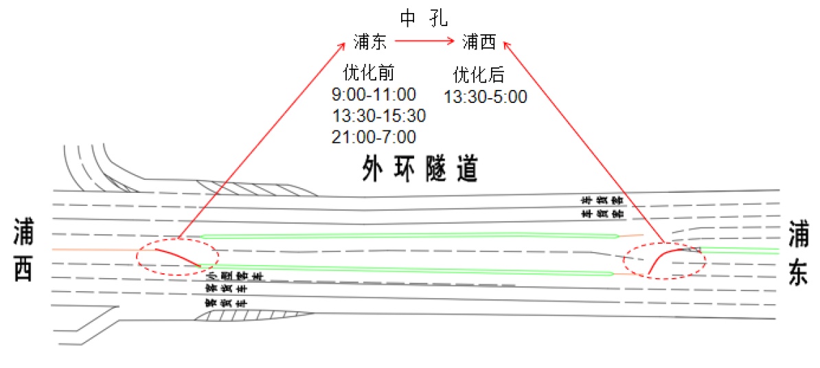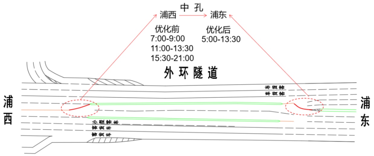 浦东往浦西方向由先前的9:00至11:00、13:30至15:30、21:00至次日7:00三段式通行优化调整为13:30至次日5:00东向西通行。