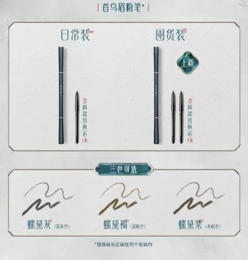 在花西子眉粉笔的详情页里,直接写着“本品复刻“螺子黛”眉料”,给眉笔起的名字也是螺黛灰、螺黛栗、螺黛褐,“螺子黛风”十足。