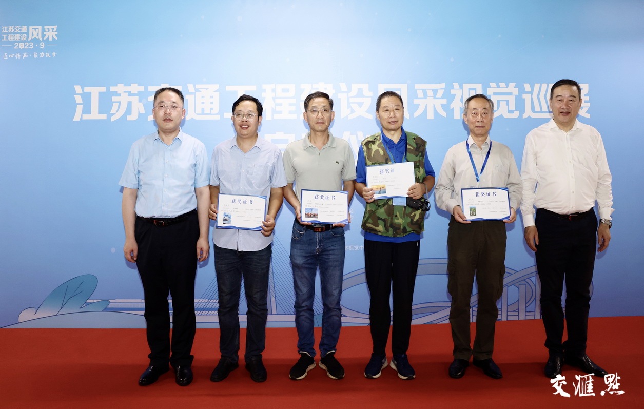 省交通运输厅党组成员,省交通工程建设局局长、党组书记蒋振雄,省摄影家协会驻会副主席兼秘书长徐健共同为2023“交建杯”视觉巡展获奖者颁奖并合影。